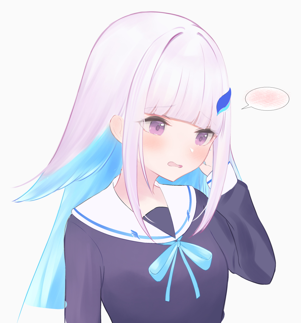 1girl black_shirt blue_bow blue_hair blunt_bangs blush bow breasts grey_background hair_intakes hair_ornament hand_up lize_helesta long_hair long_sleeves multicolored_hair nijisanji open_mouth pink_hair puffy_long_sleeves puffy_sleeves purple_eyes roido_(taniko-t-1218) sailor_collar shirt simple_background small_breasts solo spoken_blush two-tone_hair upper_body virtual_youtuber wavy_mouth white_sailor_collar