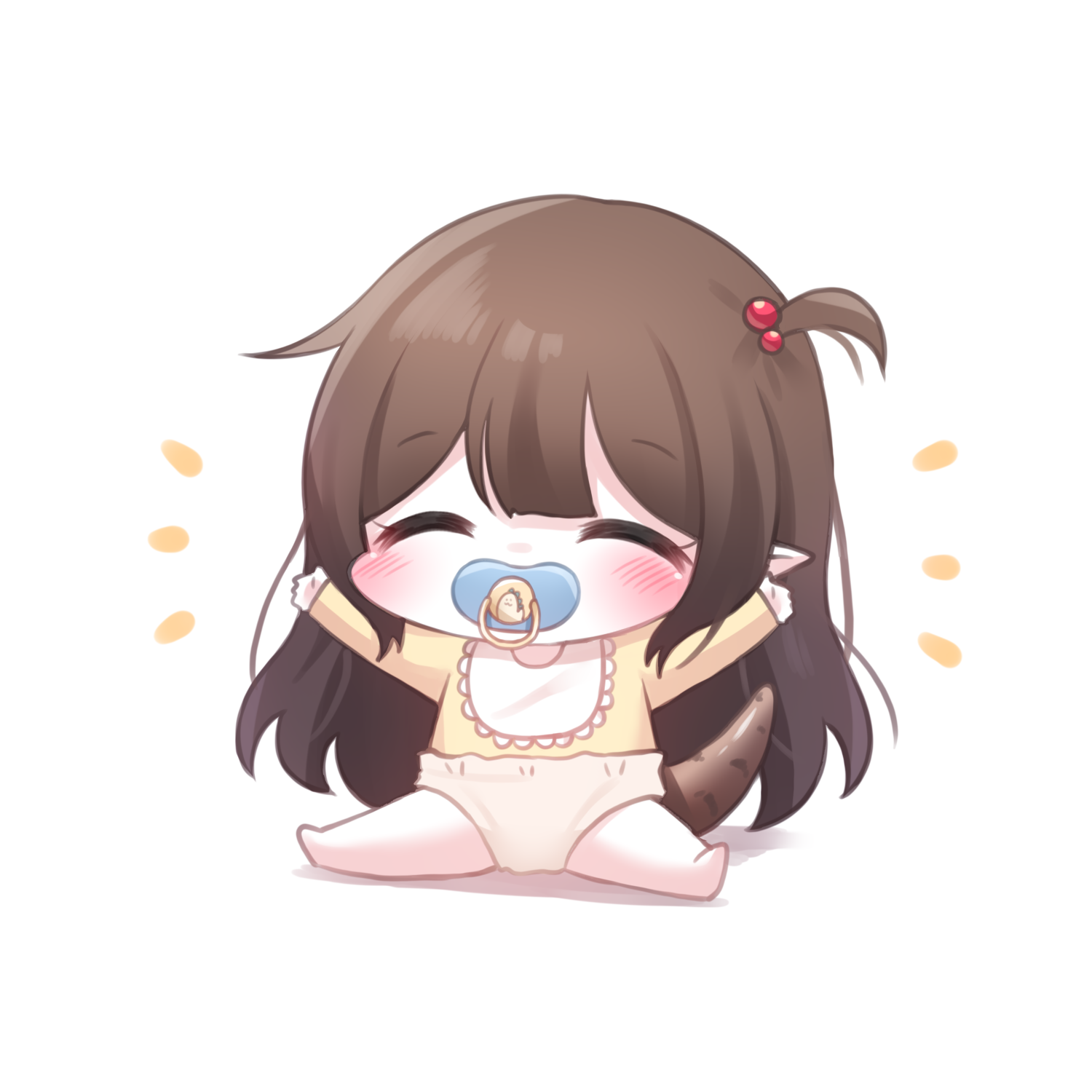 1girl ^_^ bare_legs barefoot bib blush brown_hair character_request chibi closed_eyes commentary_request facing_viewer full_body hair_bobbles hair_ornament hands_up highres honyang korean_commentary long_hair long_sleeves notice_lines novelpia one_side_up pacifier shadow shirt simple_background sitting solo tail very_long_hair white_background yellow_shirt