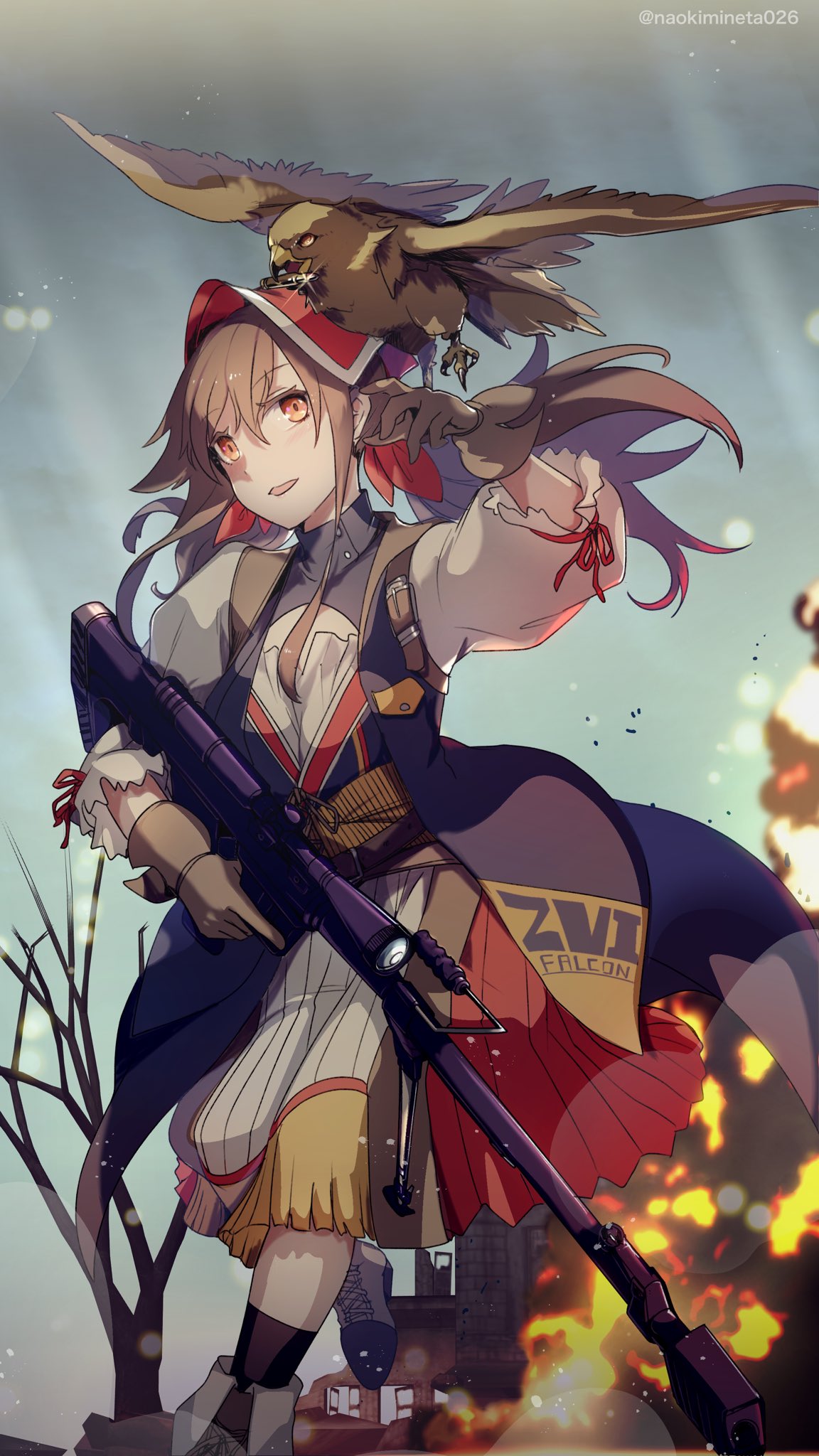 1girl ammunition anti-materiel_rifle bipod bird bolt-action_rifle brown_gloves bullpup cartridge character_name dress falcon falcon_(girls'_frontline) falconry fire girls'_frontline gloves gun highres holding holding_gun holding_weapon long_hair mineta_naoki open_mouth orange_eyes outdoors rifle rifle_cartridge scope sniper_rifle solo trigger_discipline twintails twitter_username weapon zvi_falcon