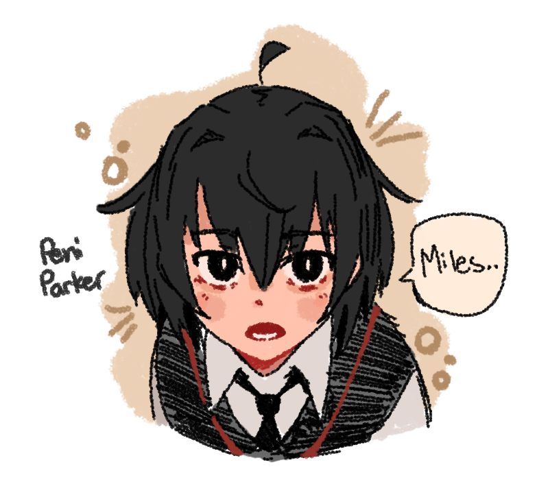 1girl ahoge black_eyes black_hair black_necktie black_sweater_vest blush bright_pupils brown_background character_name close-up commentary cyanidegray dress_shirt english_commentary english_text frown hair_between_eyes long_bangs looking_at_viewer lower_teeth_only marvel necktie notice_lines open_mouth peni_parker portrait school_uniform shirt sketch solo speech_bubble spider-man:_across_the_spider-verse spider-man_(series) spider-verse sweater_vest teeth white_background white_pupils white_shirt