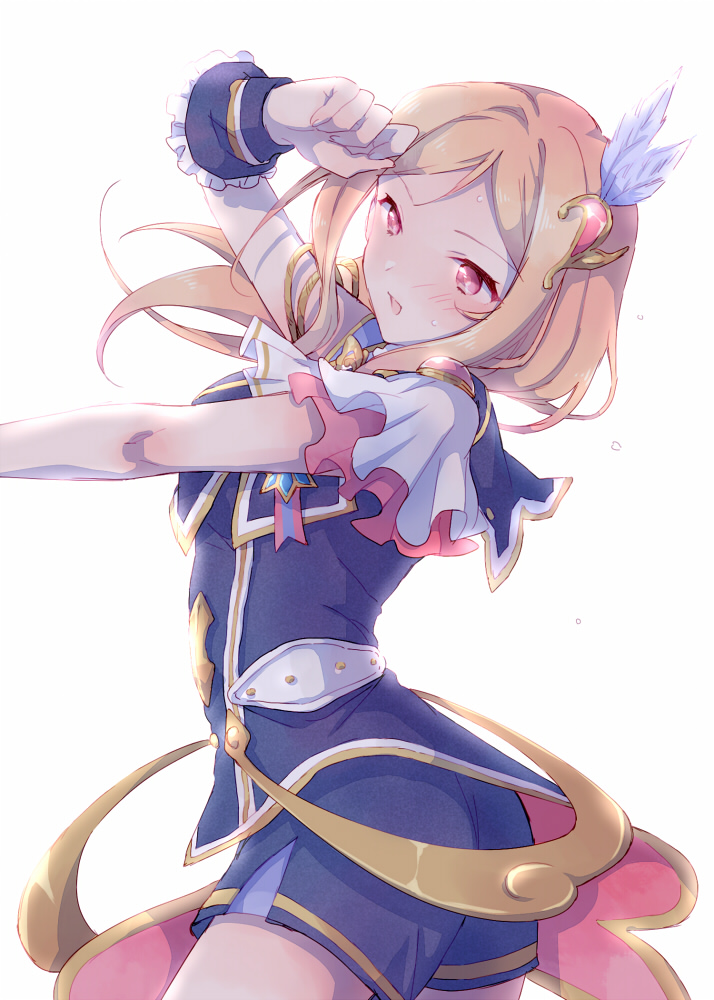 1girl arm_up blonde_hair blue_shirt blue_shorts blue_sleeves blush breasts cowboy_shot dancing detached_sleeves dot_nose frilled_sleeves frills hair_ornament hands_up idolmaster idolmaster_million_live! idolmaster_million_live!_theater_days long_hair looking_at_another lumiere_papillon_(idolmaster) medium_breasts momose_rio open_mouth red_eyes shirt shorts side_slit simple_background single_bare_shoulder solo sweat sweatdrop wato_(ko) white_background wing_hair_ornament