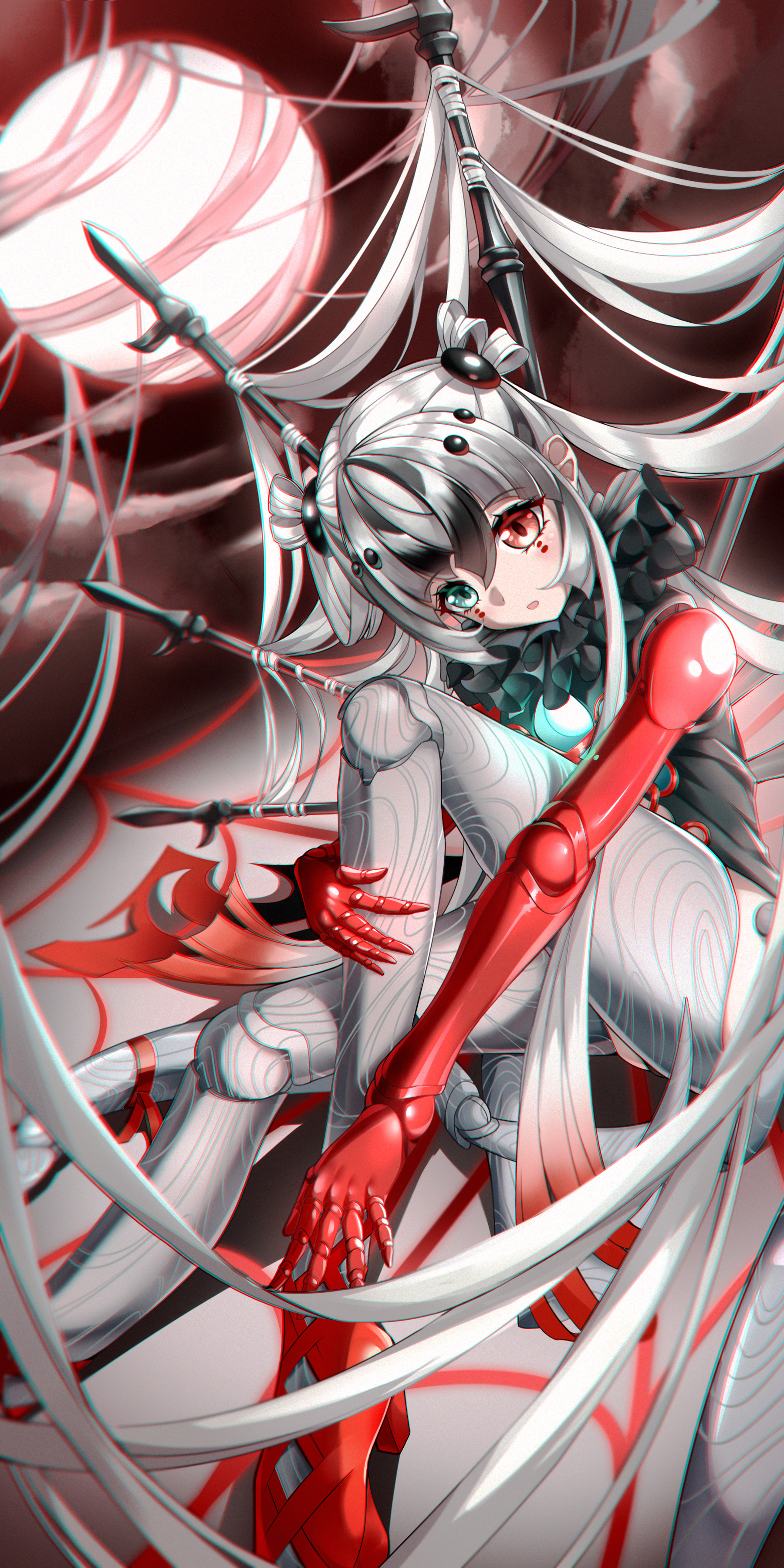 1girl absurdres blue_eyes doll_joints fate/grand_order fate_(series) full_moon grey_hair hair_spread_out heterochromia highres hugging_own_legs joints kashin_koji_(fate) kashin_koji_(third_ascension)_(fate) long_hair moon neck_ruff norimori red_eyes sitting very_long_hair