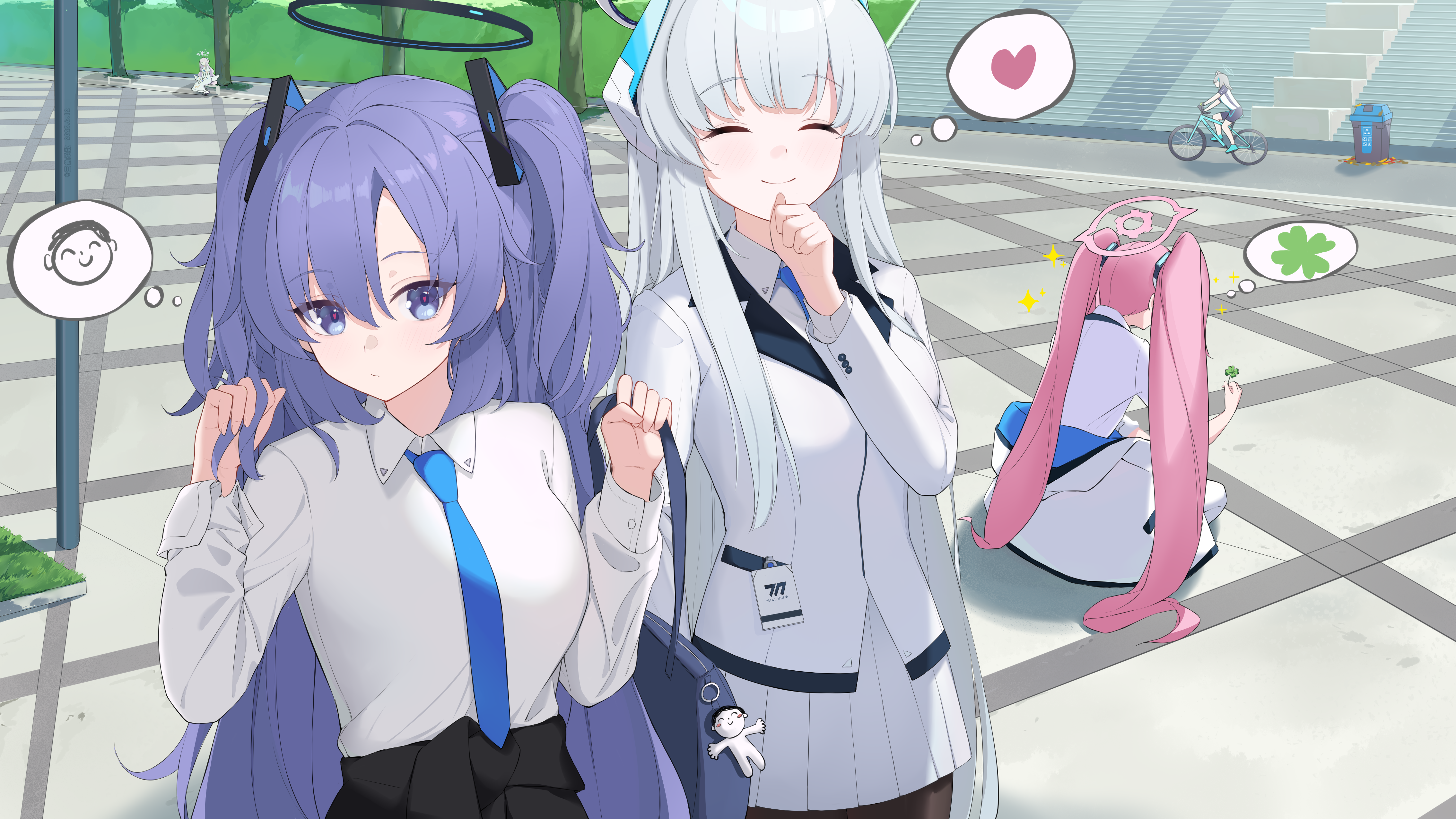 5girls ^_^ absurdres bicycle blue_archive blush breasts closed_eyes clover doodle_sensei_(blue_archive) four-leaf_clover halo heart highres jacket koyuki_(blue_archive) long_hair medium_breasts mika_(blue_archive) multiple_girls noa_(blue_archive) outdoors pleated_skirt sanjiao_hanshu sensei_(blue_archive) shiroko_(blue_archive) shiroko_(cycling)_(blue_archive) shirt skirt speech_bubble straight_hair thought_bubble trash_can twintails two_side_up very_long_hair white_jacket white_shirt yuuka_(blue_archive)