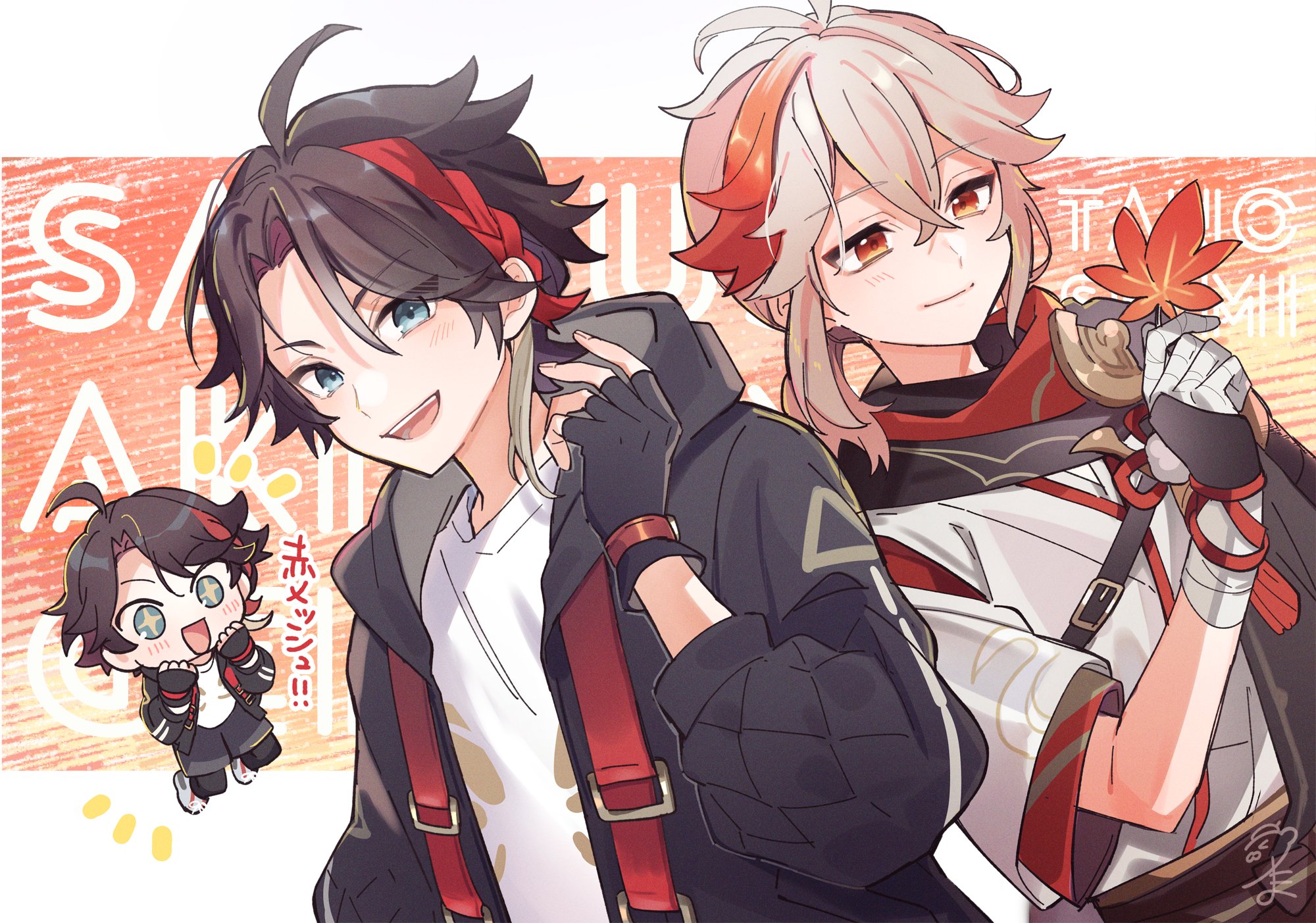 2boys aqua_eyes bandages black_gloves black_hood brown_hair fingerless_gloves genshin_impact gloves hair_between_eyes highres hood hooded_jacket jacket japanese_clothes kaedehara_kazuha leaf long_sleeves low_ponytail male_focus maple_leaf multicolored_hair multiple_boys nijisanji open_mouth ponytail red_eyes red_hair saegusa_akina saegusa_akina_(4th_costume) short_hair streaked_hair tama_(songe) two-tone_hair virtual_youtuber