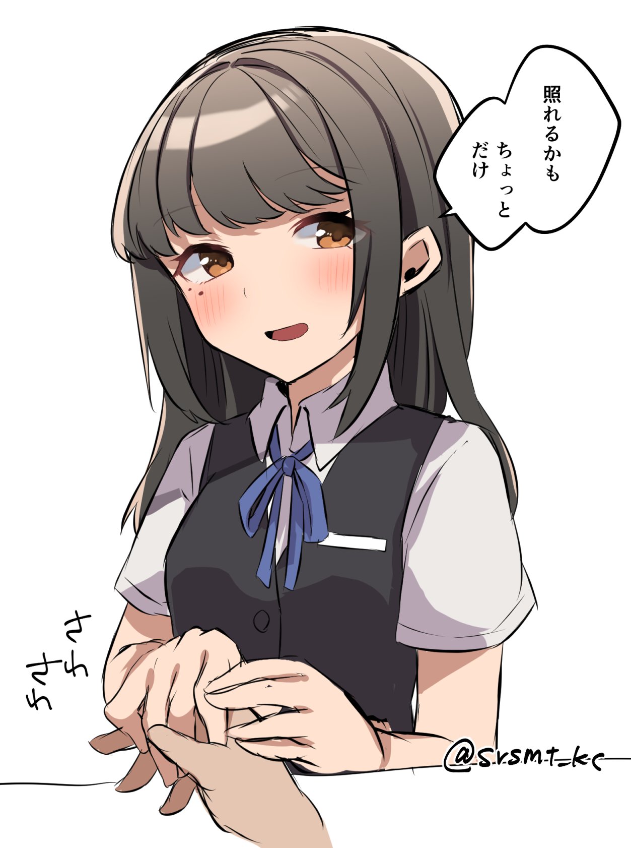 1girl 1other black_vest brown_eyes collared_shirt dress_shirt hayashio_(kancolle) highres holding_hands kantai_collection long_hair looking_at_viewer mole mole_under_eye school_uniform shirasumato shirt simple_background smile swept_bangs translation_request twitter_username upper_body vest white_background white_shirt