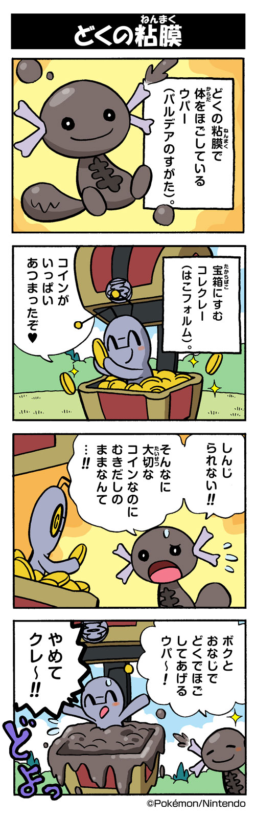 4koma coin comic company_name copyright_name dirty flying_sweatdrops furigana gimmighoul gimmighoul_(chest) highres mud narration nintendo no_humans official_art paldean_wooper pokemon pokemon_(creature) smile sound_effects sparkle speech_bubble sweatdrop translation_request wavy_mouth yamashita_takahiro