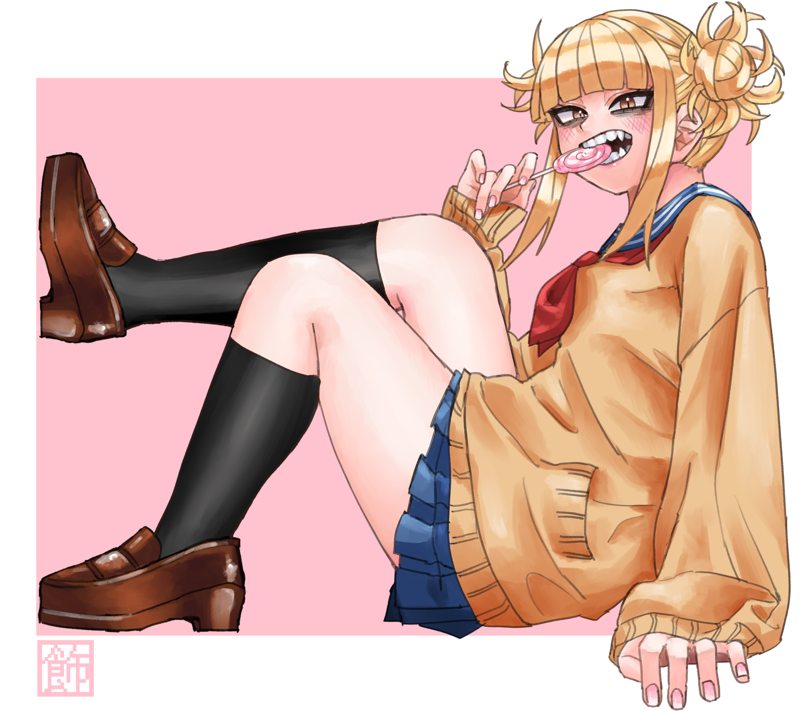 1girl absurdres blonde_hair blue_skirt blunt_bangs blush boku_no_hero_academia brown_eyes candy cardigan double_bun fangs food hair_bun highres kazari_kabocya loafers lollipop messy_hair pleated_skirt school_uniform serafuku shoes sidelocks sitting skirt slit_pupils solo toga_himiko
