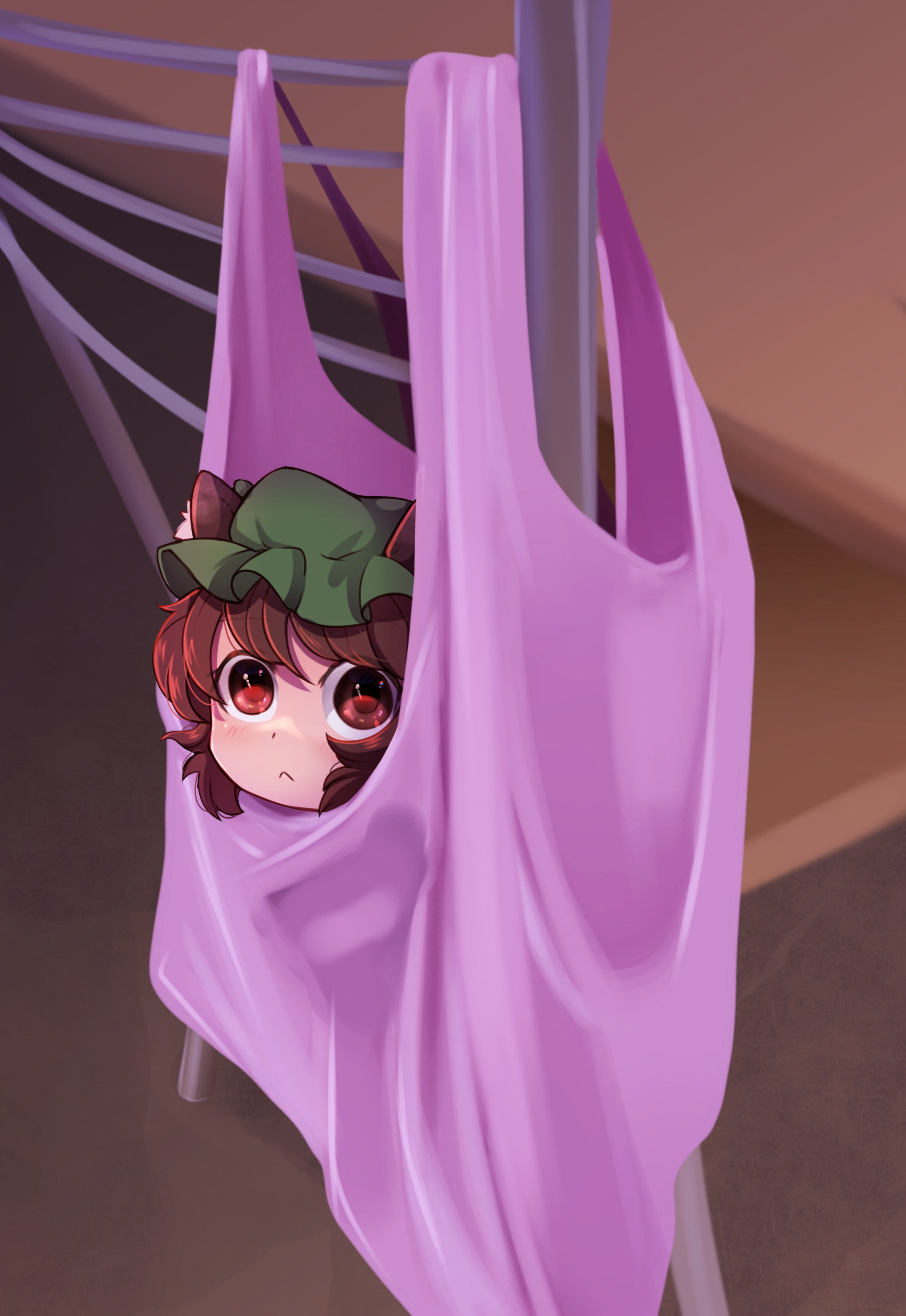 1girl :< absurdres animal_ears bag blush brown_eyes brown_hair cat_ears chair chen closed_mouth commentary dungeon_toaster english_commentary green_hat hat highres in_bag in_container looking_at_viewer mob_cap short_hair solo touhou
