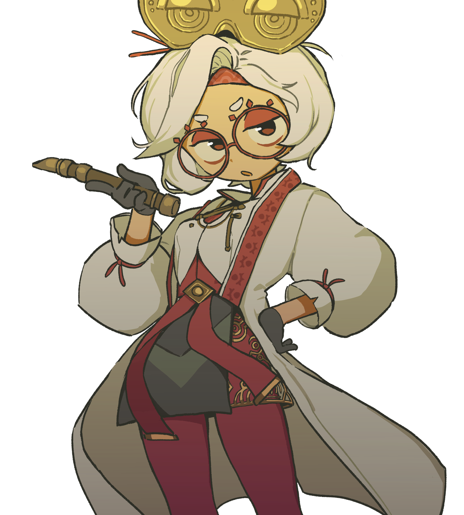 1girl :o asymmetrical_bangs black_gloves black_skirt breast_cutouts breasts coat commentary dot_nose english_commentary eyeshadow feet_out_of_frame flute glasses gloves goggles goggles_on_head gold_trim hair_ornament hair_stick hand_on_own_hip hand_up headband highres holding holding_instrument instrument long_sleeves looking_at_viewer makeup medium_breasts medium_hair medium_skirt nintendo open_mouth orenjipiiru pantyhose parted_bangs puffy_long_sleeves puffy_sleeves purah red-framed_eyewear red_eyes red_eyeshadow red_headband red_pantyhose red_shirt round_eyewear see-through_clothes see-through_shirt sheikah shirt short_eyebrows side_slit simple_background skirt solo standing straight_hair swept_bangs the_legend_of_zelda the_legend_of_zelda:_tears_of_the_kingdom thick_eyebrows two-tone_shirt white_background white_coat white_hair white_shirt