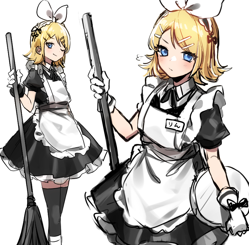 1girl apron black_dress black_thighhighs blonde_hair blue_eyes boots closed_mouth dress gloves hair_ornament hairpin kagamine_rin looking_at_viewer maid maid_apron maid_headdress one_eye_closed short_hair short_sleeves sketch solo soramame_pikuto thighhighs vocaloid white_boots white_gloves