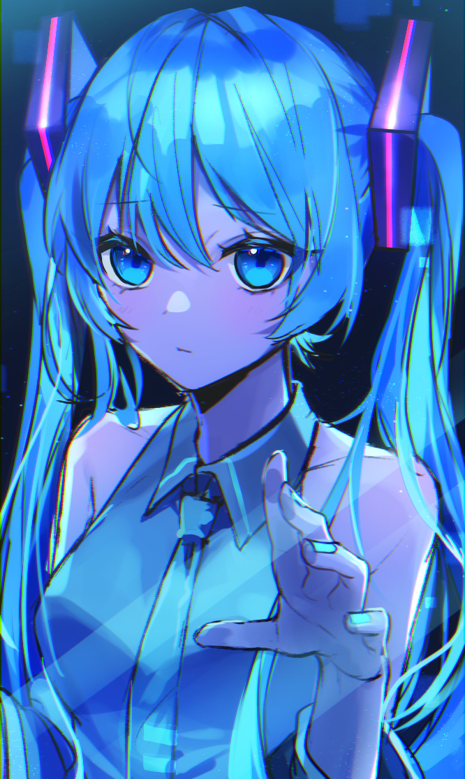 1girl black_background blue_background blue_eyes blue_hair blue_nails blue_necktie closed_mouth collared_shirt grey_shirt hatsune_miku long_hair looking_at_viewer multicolored_background necktie shirt sleeveless sleeveless_shirt solo soramame_pikuto twintails vocaloid wrist_cuffs
