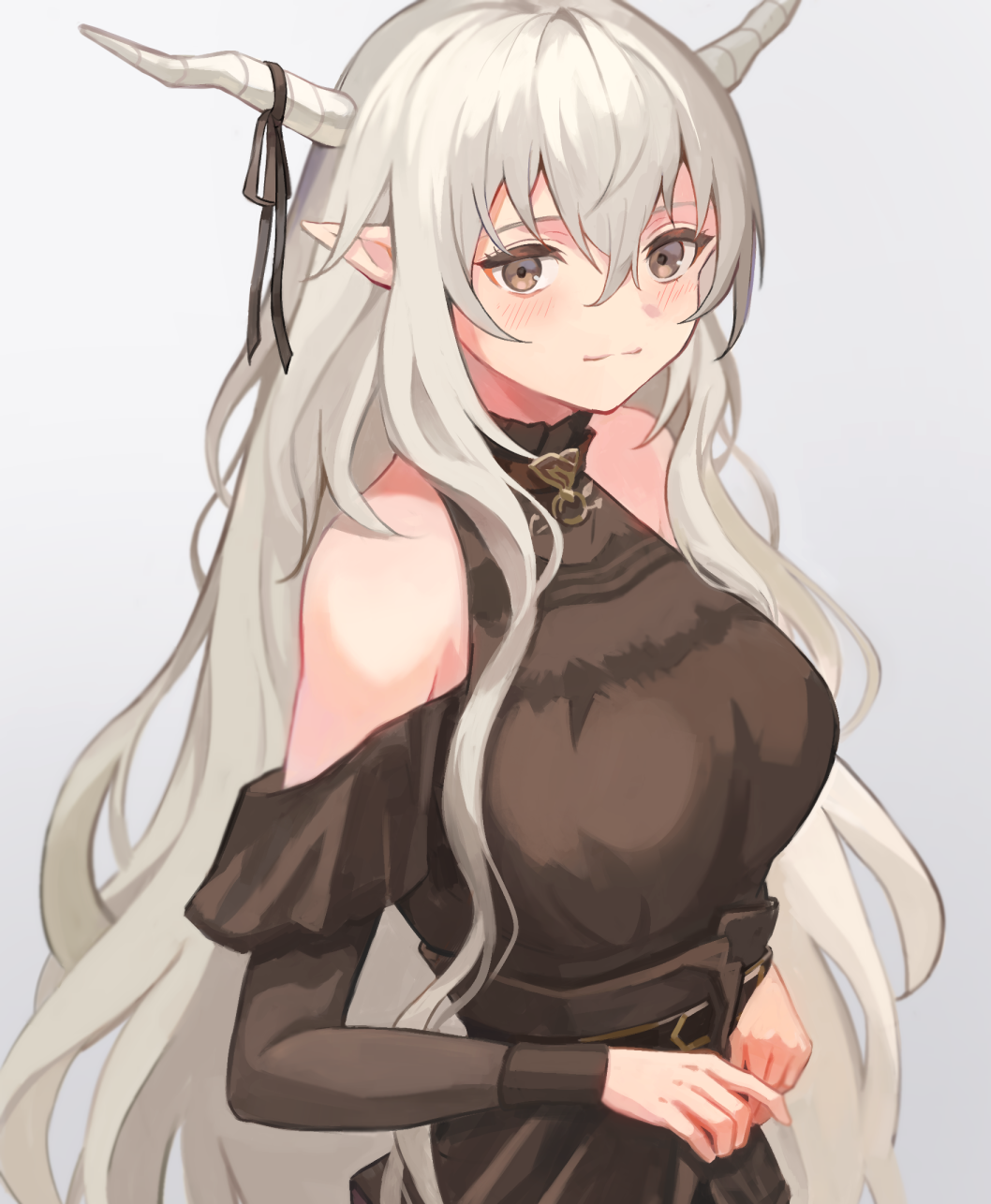 1girl ambience_synesthesia arknights bare_shoulders black_dress blush breasts brown_eyes closed_mouth demon_horns dress hair_between_eyes highres horn_ornament horn_ribbon horns large_breasts long_hair looking_at_viewer official_alternate_costume own_hands_together pointy_ears ribbon shining_(ambience_synesthesia)_(arknights) shining_(arknights) simple_background smile solo standing touchika very_long_hair white_background white_hair