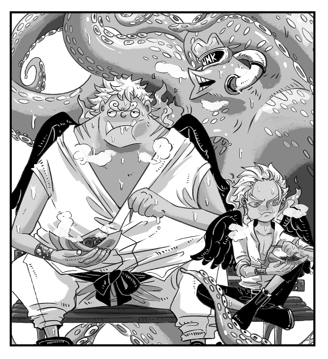 1other 2boys belt black_belt black_footwear black_shorts black_wings boots border breath child dark dark_skin dougi drooling eating facing_viewer feet_out_of_frame fire fish_boy food full_body gills greyscale highres holding holding_food indian_style karate_gi legs_apart looking_down looking_to_the_side male_focus monochrome multiple_boys octopus one_piece partially_unbuttoned s-hawk s-shark sanpaku seraphim_(one_piece) shirt short_hair shorts sitting size_difference sleeves_rolled_up steam sweat tentacles very_short_hair white_background white_border white_hair white_shirt wings