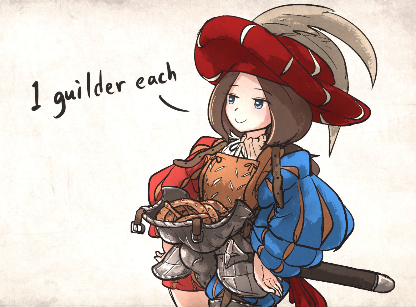 1girl armor blue_eyes boobplate breastplate brown_hair closed_mouth codpiece english_text hat ironlily landsknecht landsknecht_(ironlily) long_sleeves original puffy_long_sleeves puffy_sleeves smile solo weapon