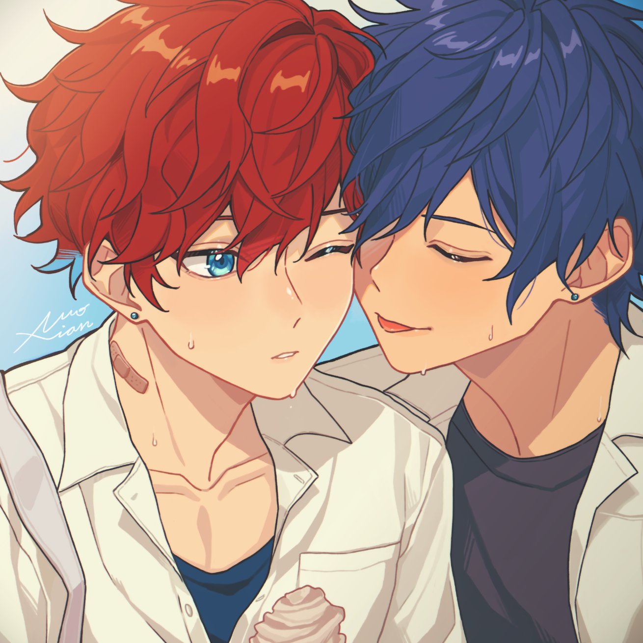 2boys amagi_hiiro aqua_eyes bandaid bandaid_on_neck black_shirt blue_hair blue_shirt chinese_commentary closed_eyes collared_shirt commentary_request dark_blue_hair earrings ensemble_stars! highres jewelry kaixuan_lushang looking_at_another male_focus multiple_boys one_eye_closed parted_lips red_hair sazanami_jun shirt short_hair stud_earrings tongue tongue_out upper_body white_shirt yaoi