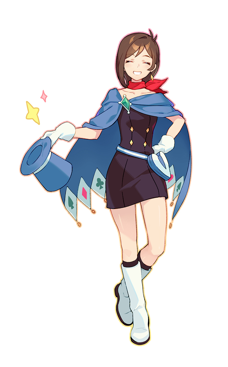 1girl ace_attorney black_dress blue_cape blue_hat boots brown_hair cape closed_eyes commentary_request dress earrings gloves grin hand_on_own_hip hat highres jewelry long_hair pagye red_scarf scarf single_earring smile solo top_hat trucy_wright unworn_hat unworn_headwear white_boots white_gloves