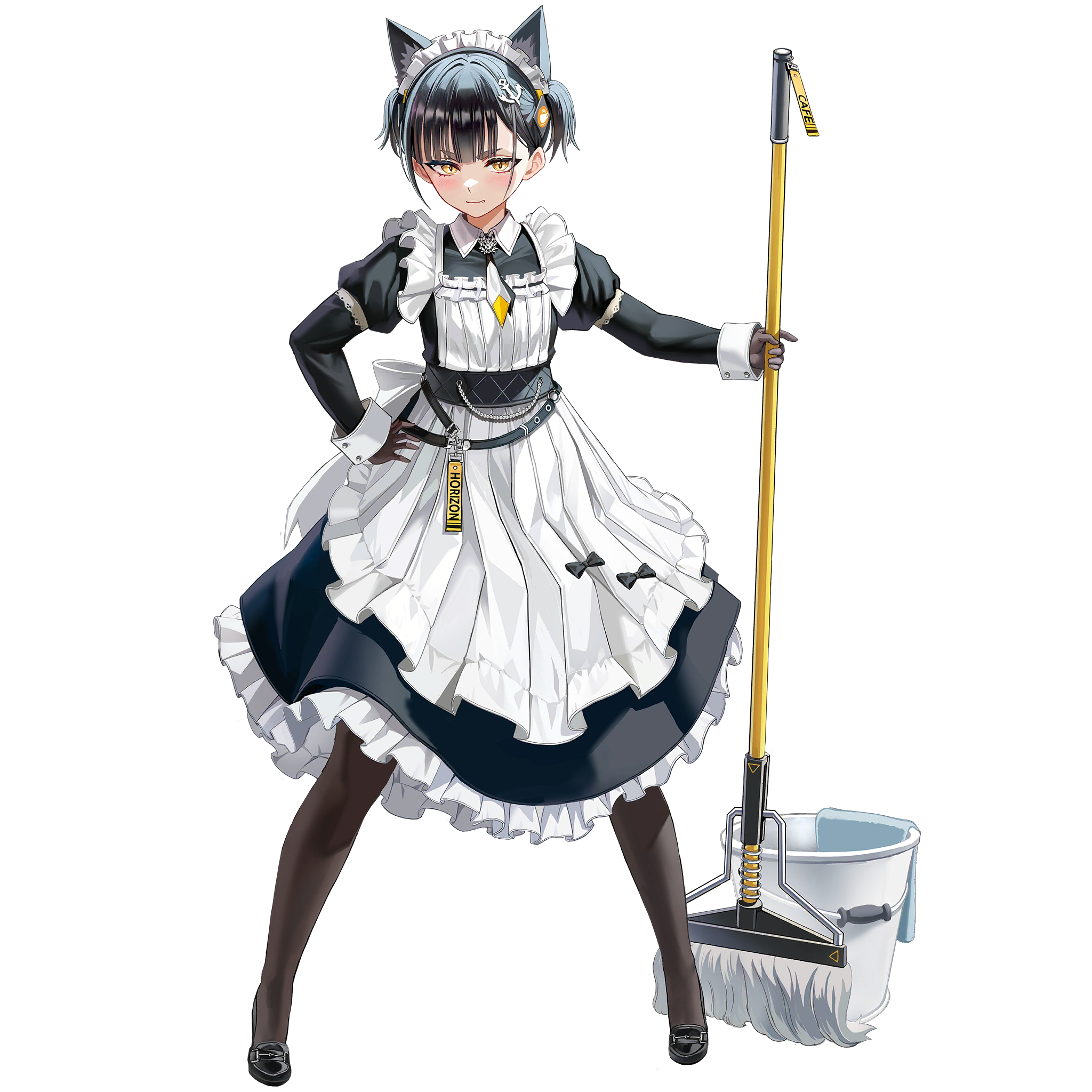 1girl anchor_hair_ornament animal_ear_fluff animal_ears apron black_dress black_footwear black_hair black_necktie black_ribbon blush breasts brown_gloves brown_thighhighs bucket chain closed_mouth collar collared_dress dog_ears dog_girl dress english_text fang frilled_apron frilled_skirt frills full_body game_cg gloves hair_ornament hand_on_own_hip high_heels highres holding holding_mop last_origin layered_skirt legs_apart long_skirt long_sleeves looking_at_viewer maid maid_apron maid_headdress medium_breasts mop multicolored_necktie necktie o-ring official_alternate_costume official_art puffy_sleeves pumps ribbon short_hair short_necktie short_twintails simple_background skirt slit_pupils smile solo standing tachi-e taesi tag thick_eyebrows thighhighs third-party_source towel transparent_background twintails vargr_(last_origin) white_apron white_collar white_necktie white_ribbon wrist_cuffs yellow_eyes yellow_necktie