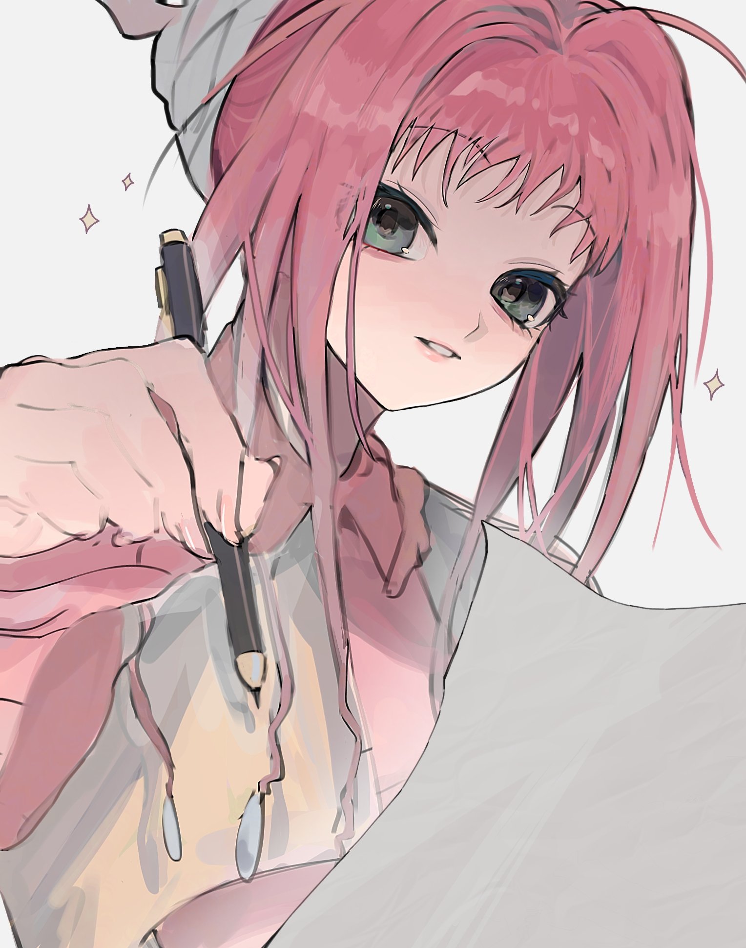 1girl dress green_eyes headdress highres holding holding_pen hunter_x_hunter long_hair looking_at_viewer neon_nostrade pen pink_hair simple_background smile solo sparkle upper_body white_background white_dress writing ziyuuuuuuda