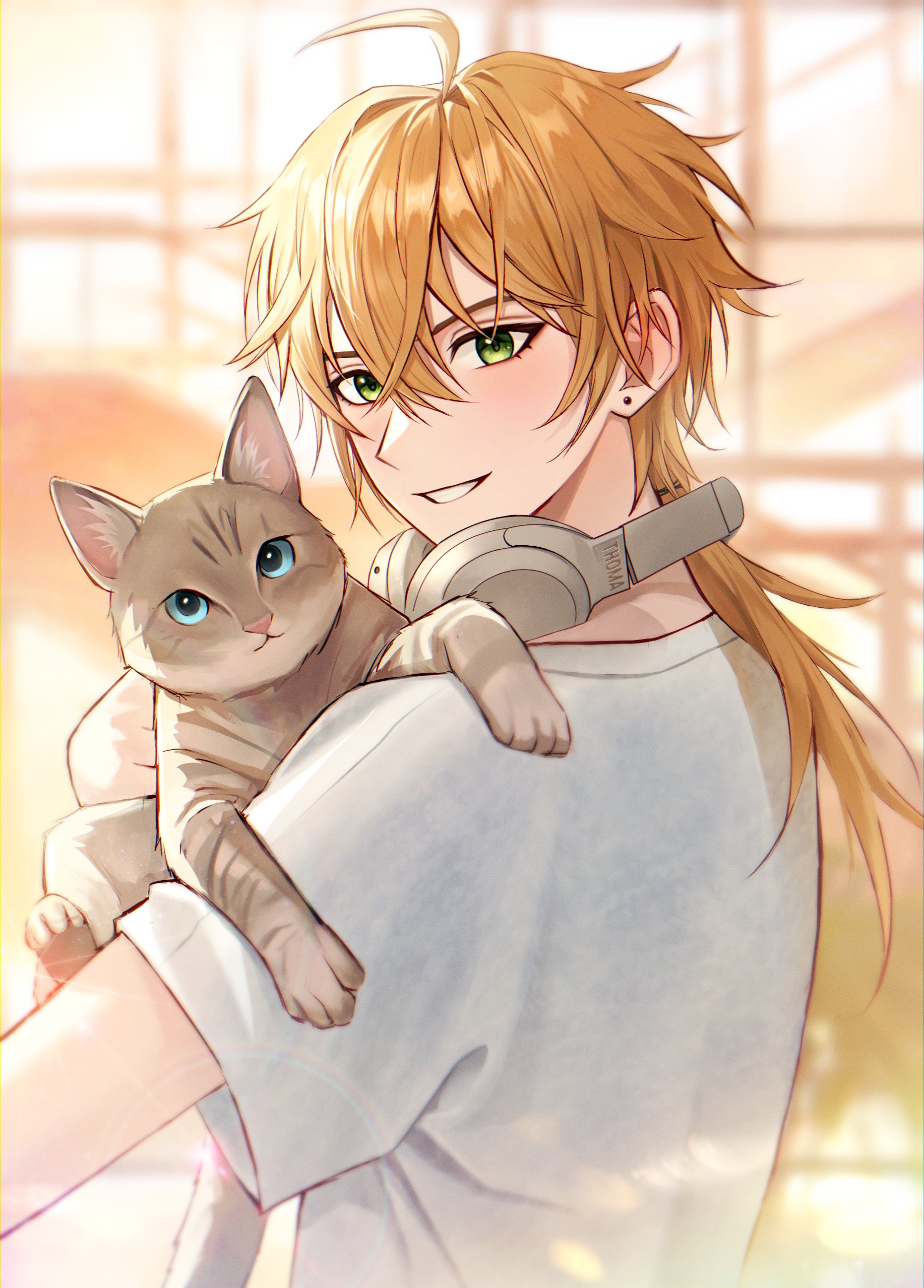 1boy absurdres blonde_hair cat earrings genshin_impact green_eyes hair_between_eyes headphones headphones_around_neck highres jewelry long_hair male_focus ponytail pponnya shirt short_sleeves smile t-shirt teeth thoma_(genshin_impact) white_shirt