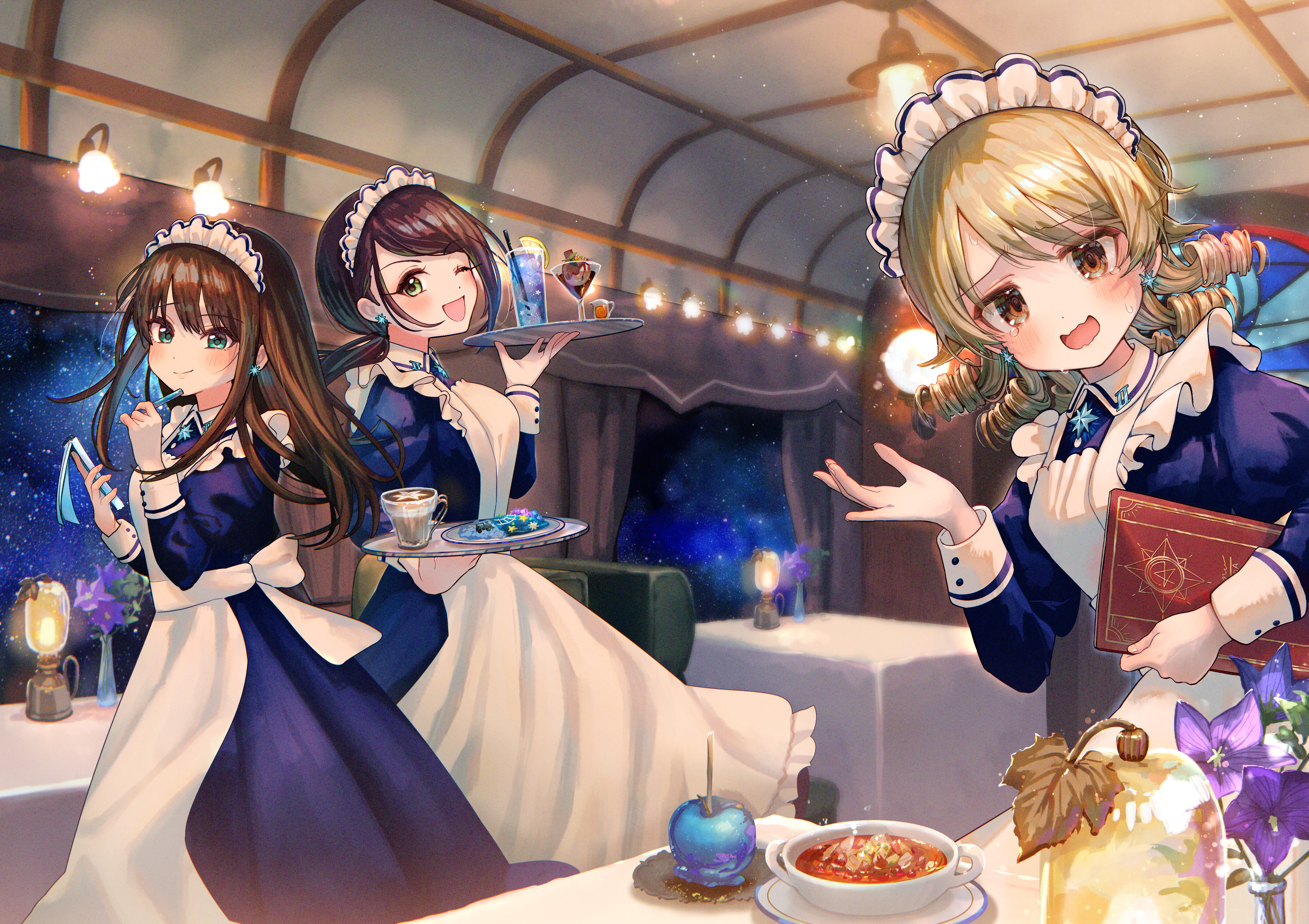 3girls ;d absurdres alternate_costume apron blue_dress blush brown_hair dress drill_hair enmaided food highres holding holding_menu holding_notebook holding_tray idolmaster idolmaster_cinderella_girls juliet_sleeves light_brown_hair long_sleeves looking_at_viewer maid maid_headdress menu morikubo_nono multiple_girls notebook one_eye_closed open_mouth puffy_sleeves restaurant shibuya_rin smile soup straight_hair swept_bangs train train_interior tray white_apron yamato_aki yukinuno