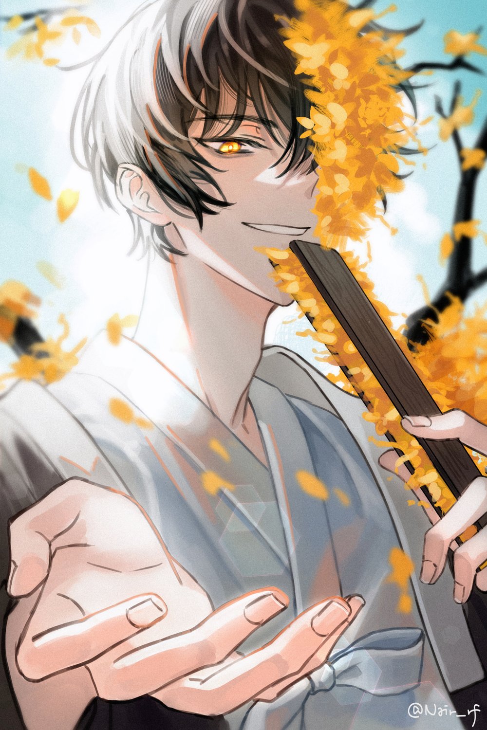 1boy black_hair commentary_request e.g.o_(project_moon) falling_petals flower folded_fan folding_fan grin hanbok hand_fan highres holding holding_fan korean_clothes korean_commentary limbus_company male_focus nair outstretched_hand petals project_moon short_hair smile solo spicebush_(e.g.o) yellow_eyes yellow_flower yi_sang_(project_moon)