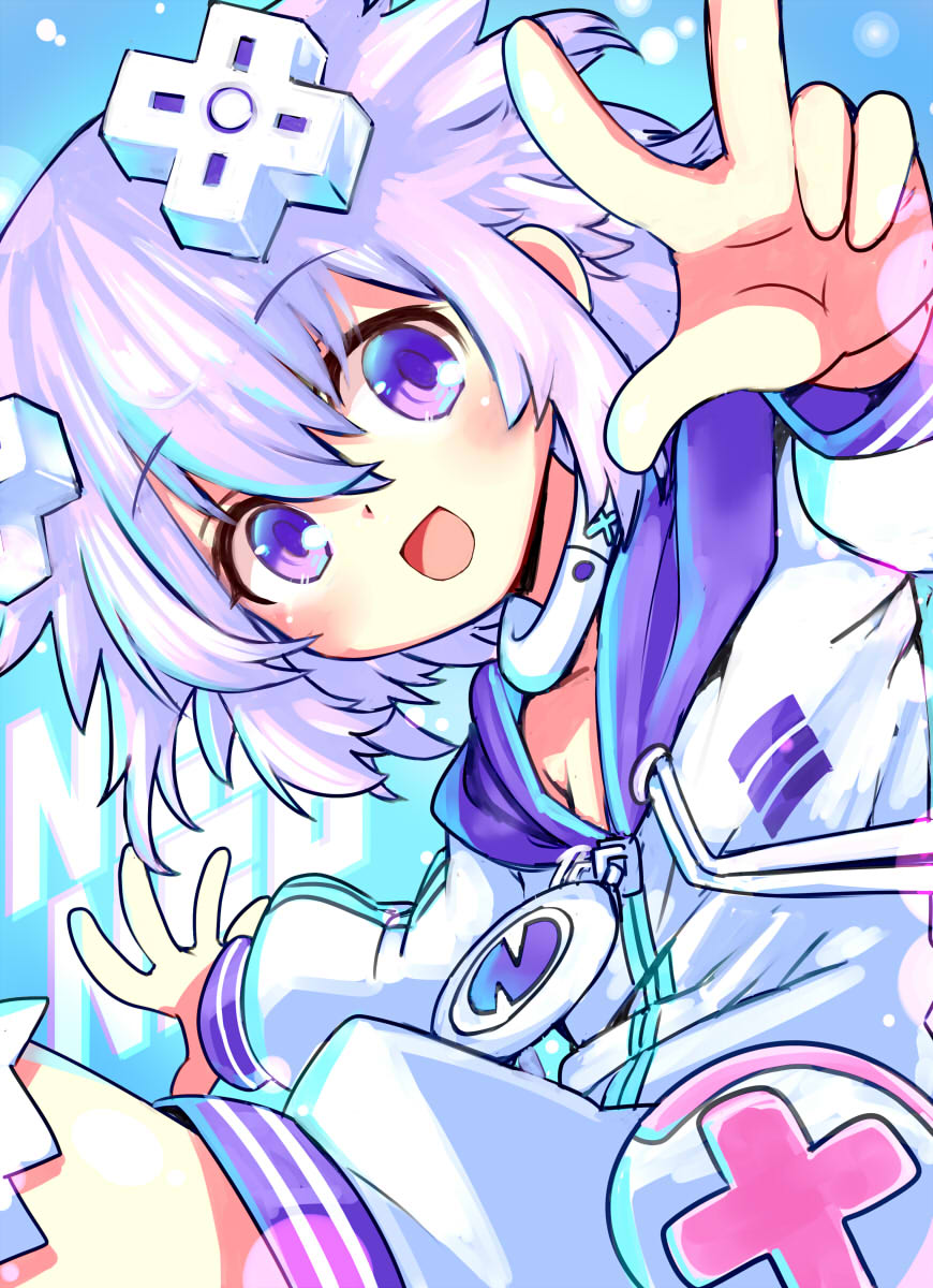 1girl ajitarou_(setsu) blue_background choker d-pad d-pad_hair_ornament english_text flat_chest hair_ornament highres matching_hair/eyes neptune_(neptunia) neptune_(series) open_mouth parka purple_eyes purple_hair short_hair solo v
