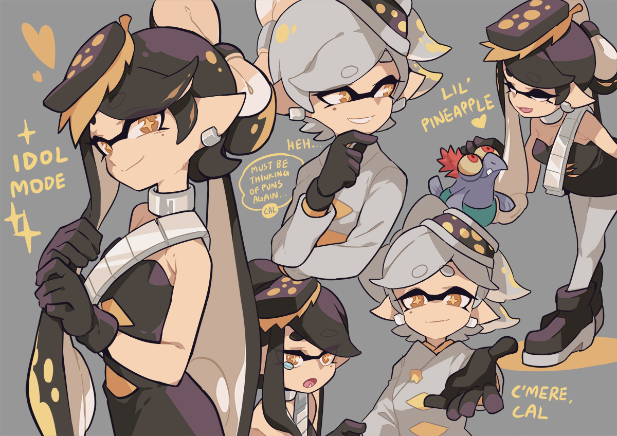 +_+ ankle_boots bandolier belt black_dress black_footwear black_gloves black_hair boots brown_eyes callie_(alterna)_(splatoon) callie_(splatoon) closed_eyes closed_mouth coat commentary cropped_torso dress earrings english_commentary english_text folded_ponytail food food_on_head gloves gomipomi grey_background grey_hair hand_on_own_chin hands_in_own_hair heart inkling jewelry leaning_forward long_hair long_sleeves looking_at_another looking_at_viewer marie_(alterna)_(splatoon) marie_(splatoon) mole mole_under_eye neck_ribbon nintendo object_on_head pantyhose petting pointy_ears reaching reaching_towards_viewer ribbon short_hair simple_background smallfry_(splatoon) smile sparkle splatoon_(series) splatoon_3 squidbeak_splatoon standing strapless strapless_dress sushi swept_bangs tearing_up tentacle_hair very_long_hair white_coat white_pantyhose