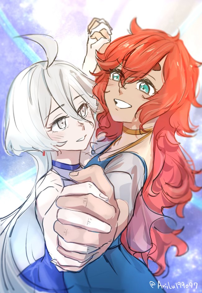 ahoge ani_lu dancing dress gundam gundam_suisei_no_majo long_hair miorine_rembran own_hands_clasped red_hair suletta_mercury white_hair