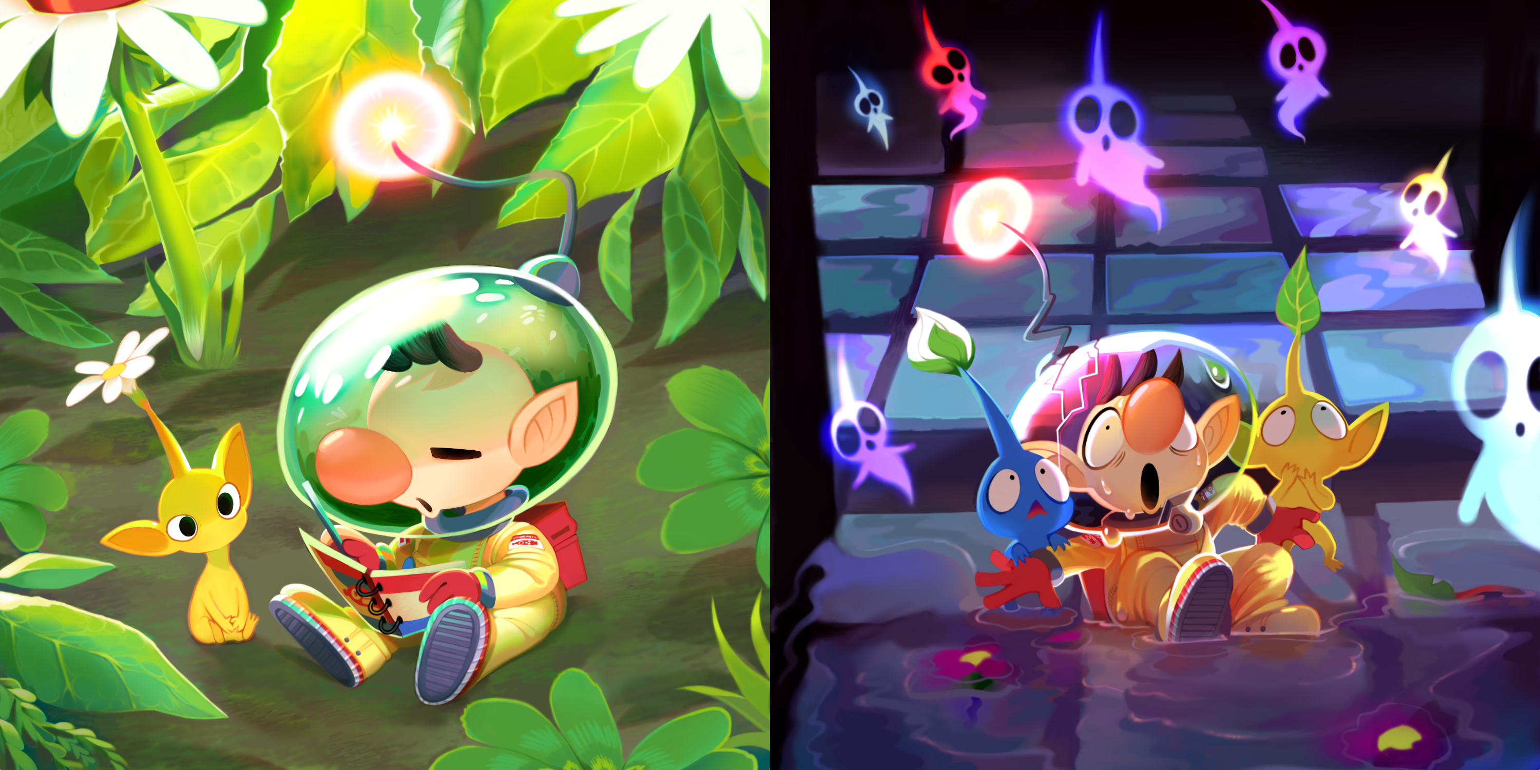 1boy :o backpack bag large_nose blue_pikmin book brown_hair bud closed_eyes commentary cracked_helmet diary english_commentary flower ghost gloves hand_to_own_mouth hands_on_another's_arm helmet highres holding holding_book holding_pen kozakana leaf looking_at_another nintendo olimar open_mouth outstretched_arms pen pikmin_(series) pink_flower pointy_ears radio_antenna red_bag red_gloves sitting space_helmet spacesuit sweat tiles tiny underground water whistle white_flower wide-eyed writing yellow_pikmin