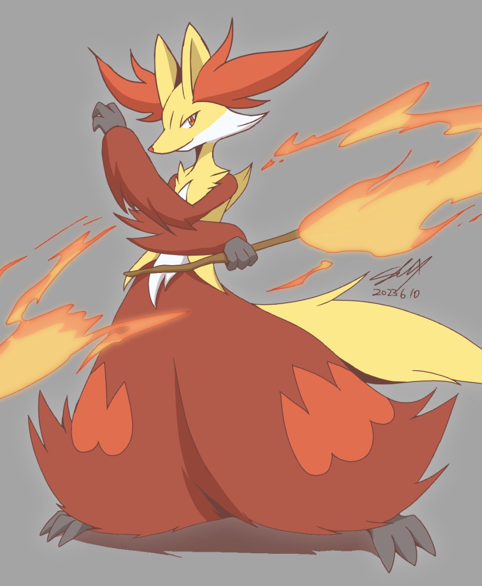 1girl animal_ear_fluff animal_ears black_fur burning closed_mouth dated delphox digitigrade fire fox_ears fox_tail furry furry_female gen_6_pokemon grey_background hand_up highres holding holding_stick looking_at_viewer multicolored_fur nintendo orange_eyes orange_fur pokemon pokemon_(creature) red_fur red_nose shuu_come signature simple_background snout solo standing stick tail tsurime white_fur yellow_fur