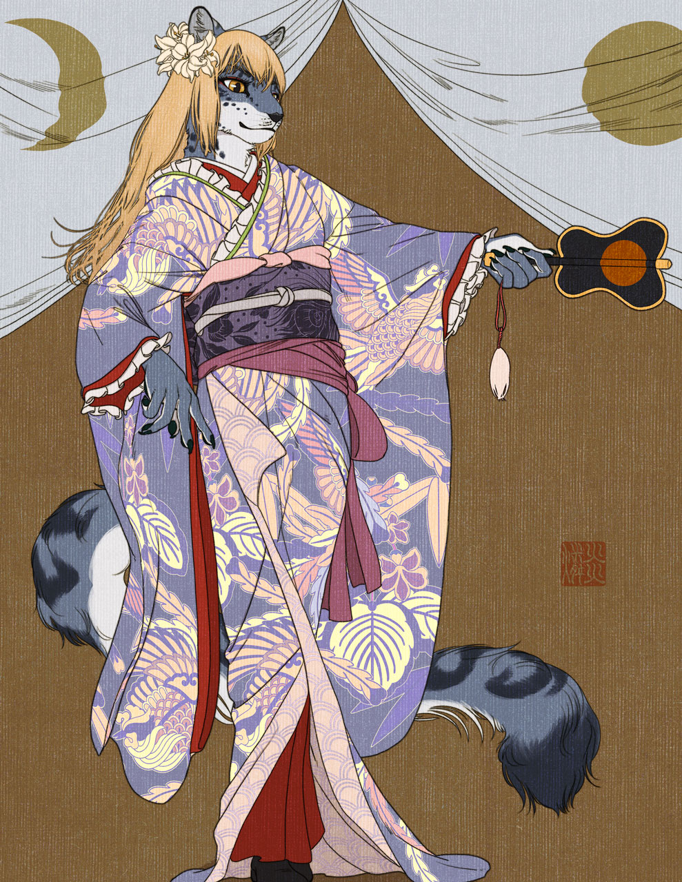 1girl animal_ear_fluff animal_ears animal_hands animal_nose arm_up artist_name black_socks blonde_hair body_fur brown_background claws closed_mouth commission crescent curtains female_focus flat_chest flat_color floral_print flower frilled_kimono frilled_sleeves frills full_body furry furry_female grey_fur gunbai hair_flower hair_ornament highres holding japanese_clothes kimono leopard_ears leopard_girl leopard_tail long_hair long_sleeves multicolored_fur multicolored_kimono obi original outstretched_arm pawpads sash sidelocks signature skeb_commission snout socks solo spotted_fur standing tail war_fan whiskers white_fur wide_sleeves yellow_eyes yellow_flower yen_rin