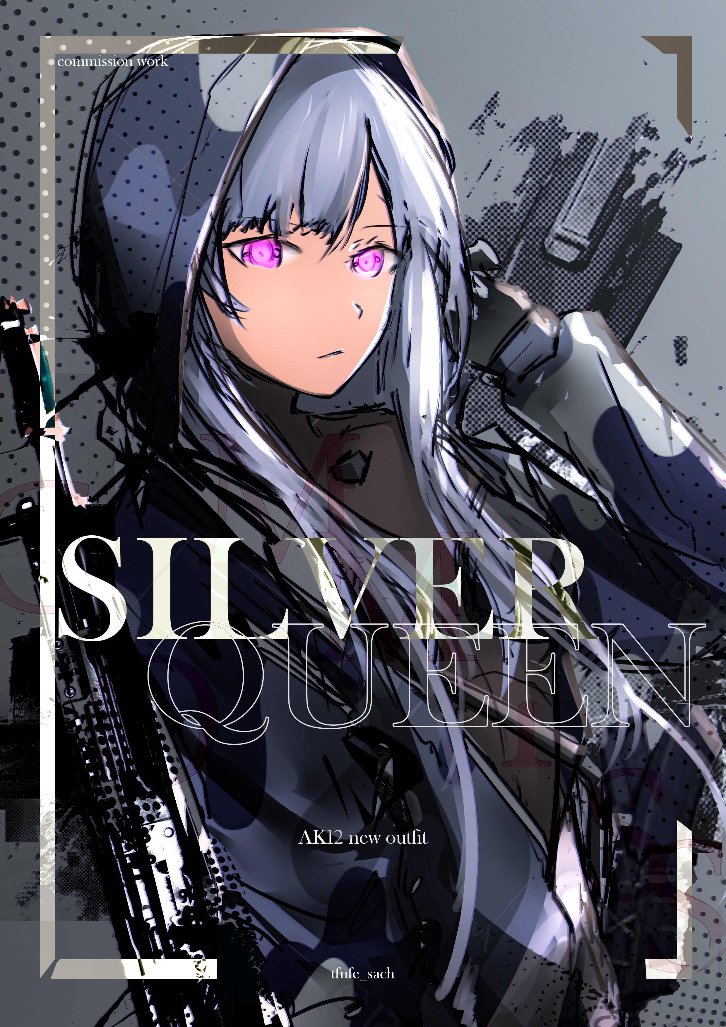 1girl absurdres ak-12 ak-12_(faint_light_of_furthest_day)_(girls'_frontline) ak-12_(girls'_frontline) assault_rifle black_gloves commission english_text girls'_frontline gloves grey_hair gun highres hood kalashnikov_rifle long_hair looking_at_viewer official_alternate_costume purple_eyes rifle solo tfnfe_sach weapon