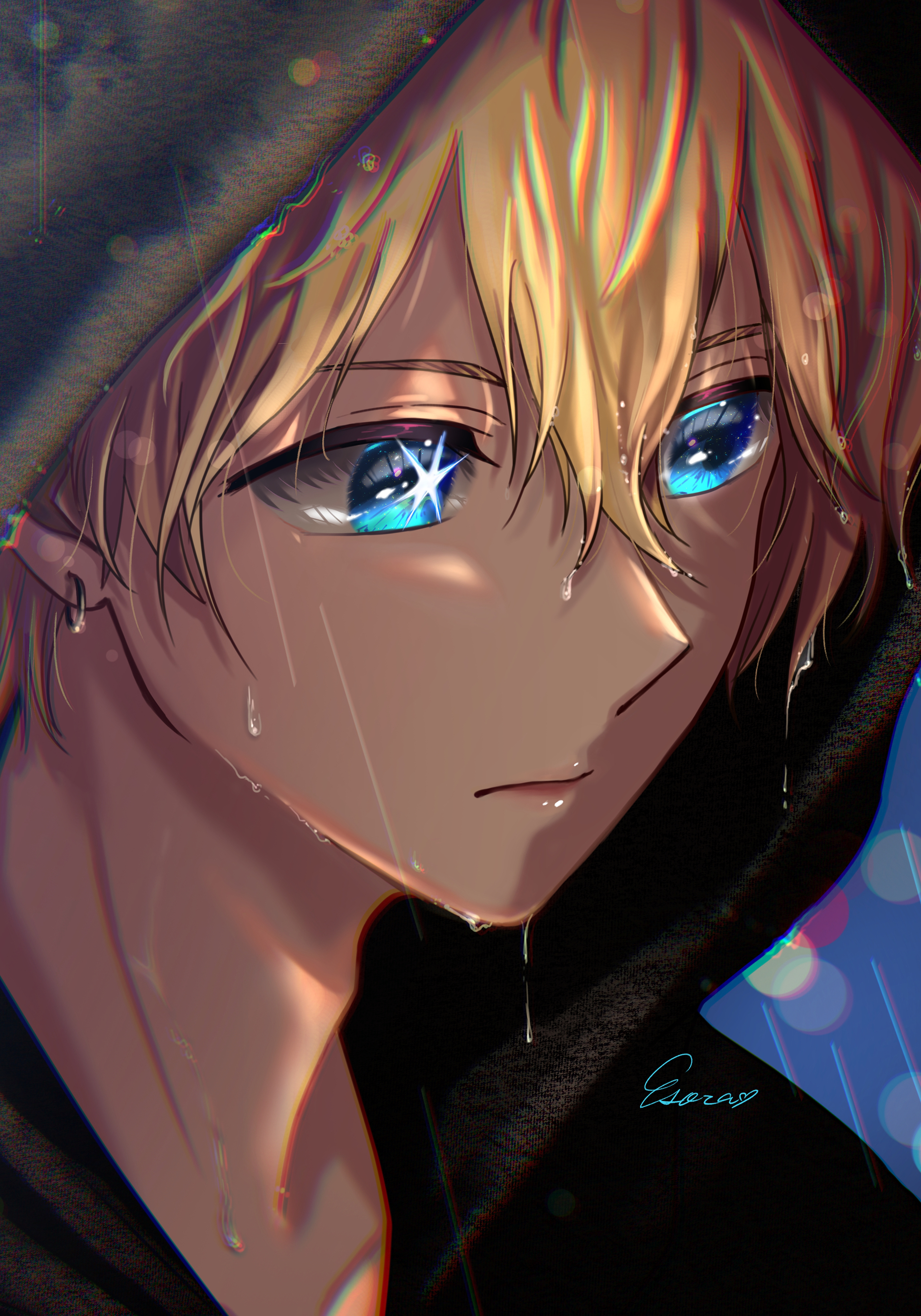 1boy absurdres blonde_hair blue_eyes closed_mouth commentary commentary_request earrings english_commentary esora-arts hair_between_eyes highres hood hood_up hoop_earrings hoshino_aquamarine jewelry male_focus mixed-language_commentary oshi_no_ko portrait rain short_hair signature solo star-shaped_pupils star_(symbol) symbol-shaped_pupils