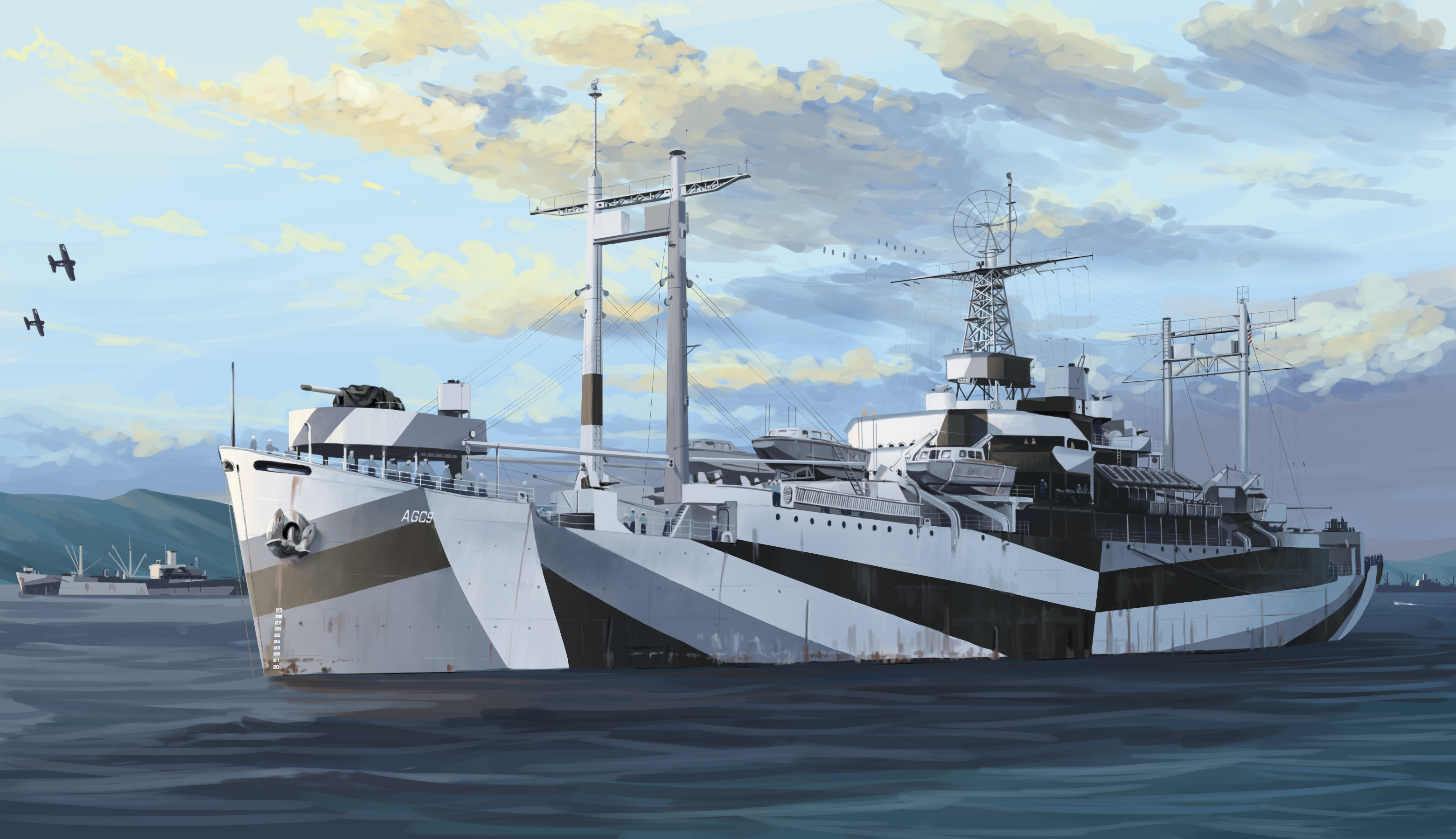 aircraft airplane blue_sky boat cloud day dazzle_paint highres military_vehicle mo_yu_de_jiaozi no_humans original outdoors propeller_fighter scenery ship sky vehicle_focus water watercraft world_war_ii