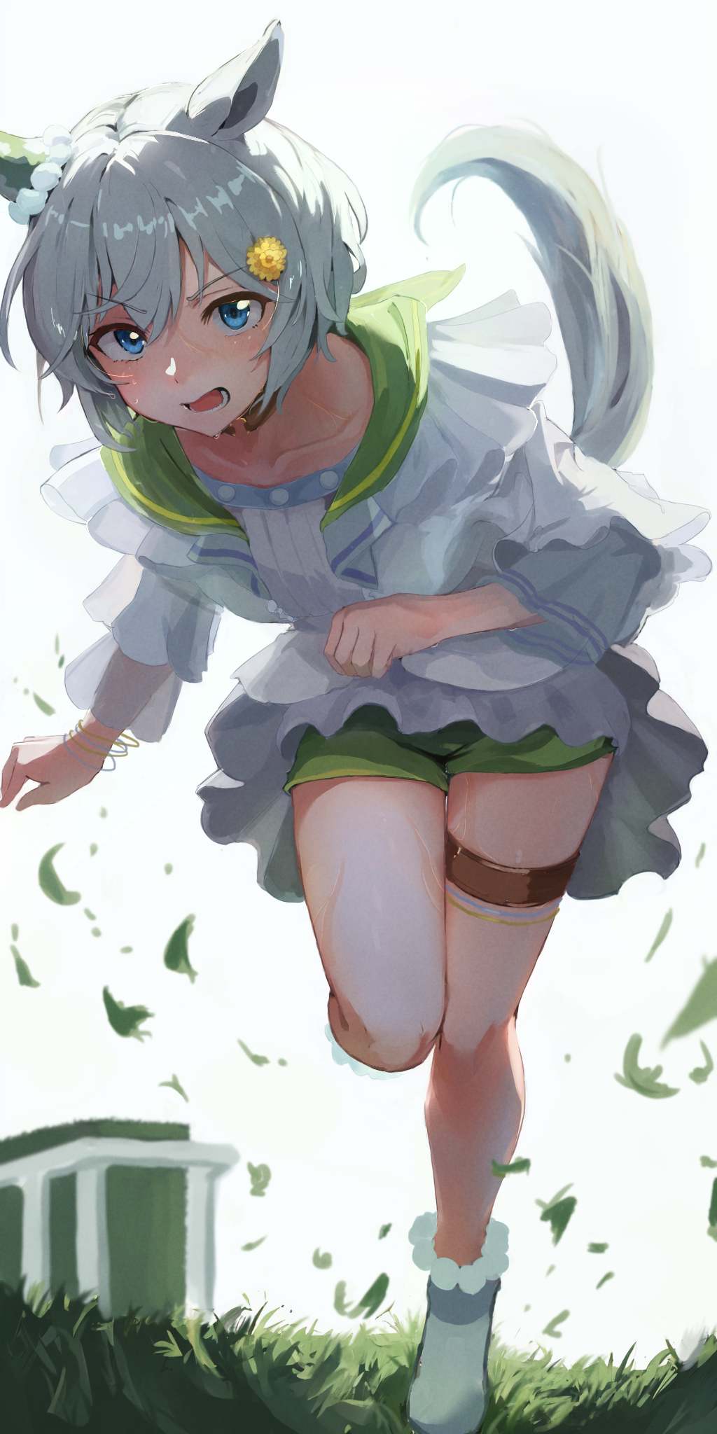 1girl adlib animal_ears blue_eyes boots choker ear_covers flower frilled_shirt frills full_body grass green_sailor_collar green_shorts hair_flower hair_ornament hairclip high_heels highres horse_ears horse_girl layered_shirt layered_sleeves light_green_hair long_sleeves looking_at_viewer open_mouth pumps running sailor_collar see-through_clothes see-through_sleeves seiun_sky_(reeling_in_the_big_one)_(umamusume) seiun_sky_(umamusume) shirt short_hair shorts single_ear_cover solo sunflower sunflower_hair_ornament thigh_strap umamusume white_boots white_shirt