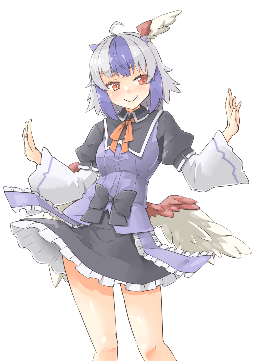 1girl ahoge arnest black_dress blue_dress blue_hair blush closed_mouth commission dress feet_out_of_frame frilled_dress frills grey_hair head_wings highres horns long_sleeves multicolored_hair red_eyes short_hair simple_background single_head_wing skeb_commission smile solo tokiko_(touhou) touhou two-tone_hair white_background wide_sleeves wings