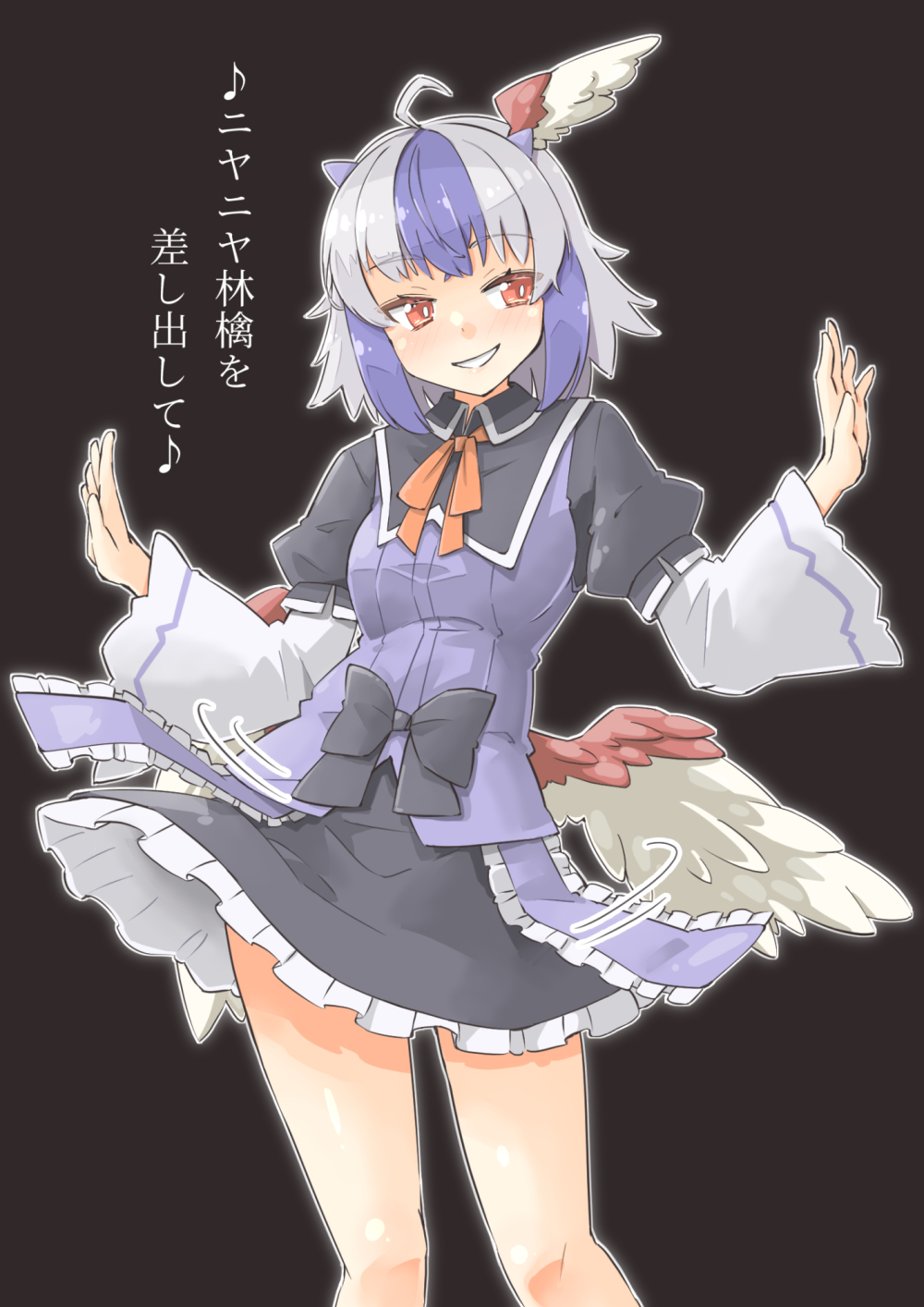 1girl ahoge arnest black_background black_dress blue_dress blue_hair blush commission dress eighth_note feet_out_of_frame frilled_dress frills grey_hair head_wings highres horns long_sleeves motion_lines multicolored_hair musical_note open_mouth red_eyes short_hair simple_background single_head_wing skeb_commission smile solo tokiko_(touhou) touhou translation_request two-tone_hair wide_sleeves wings