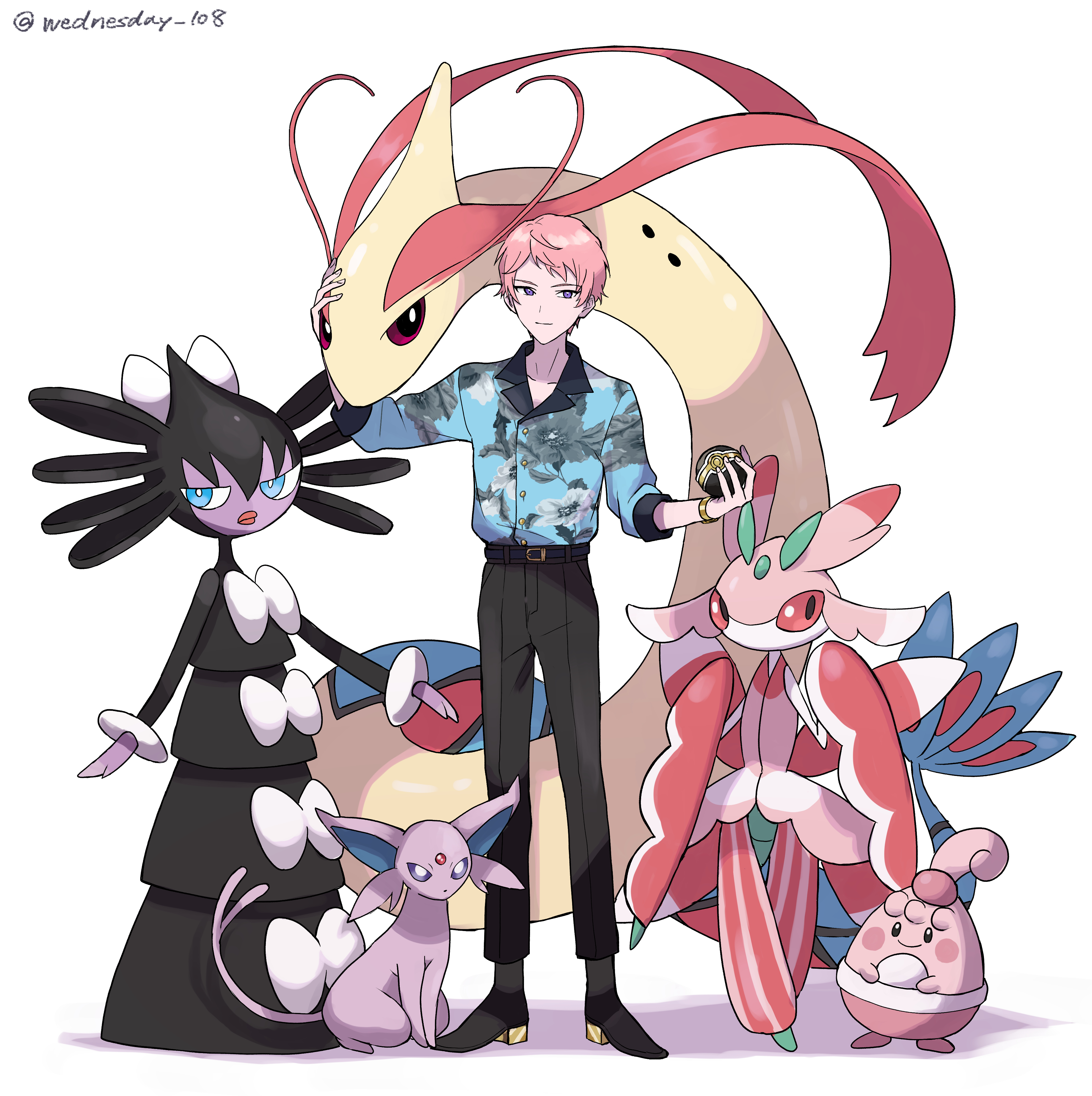 1boy absurdres black_pants blue_eyes bright_pupils closed_mouth commentary_request crossover ensemble_stars! espeon full_body gen_2_pokemon gen_3_pokemon gen_4_pokemon gen_5_pokemon gen_7_pokemon gothita happiny highres holding holding_poke_ball itsuki_shu long_hair lurantis milotic nintendo pants pink_hair poke_ball pokemon pokemon_(creature) purple_eyes short_bangs short_hair simple_background solo three-quarter_sleeves twitter_username very_long_hair watch wednesday_108 white_background white_pupils wristwatch