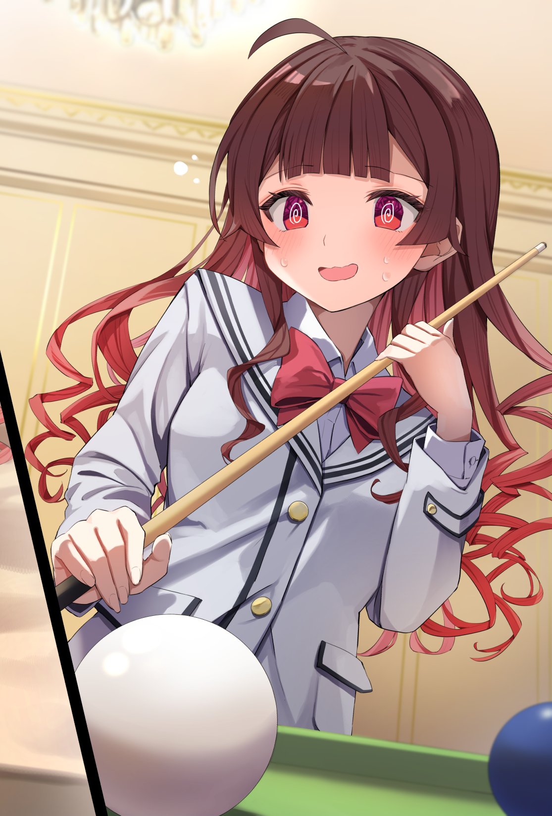 1girl @_@ ahoge ball billiard_ball billiards blush bow bowtie brown_hair collared_shirt commentary_request cue_stick drill_hair grey_jacket highres holding holding_cue_stick indoors jacket long_hair long_sleeves looking_at_viewer open_mouth original red_bow red_bowtie red_eyes shirt solo summer_tail720 sweatdrop white_shirt