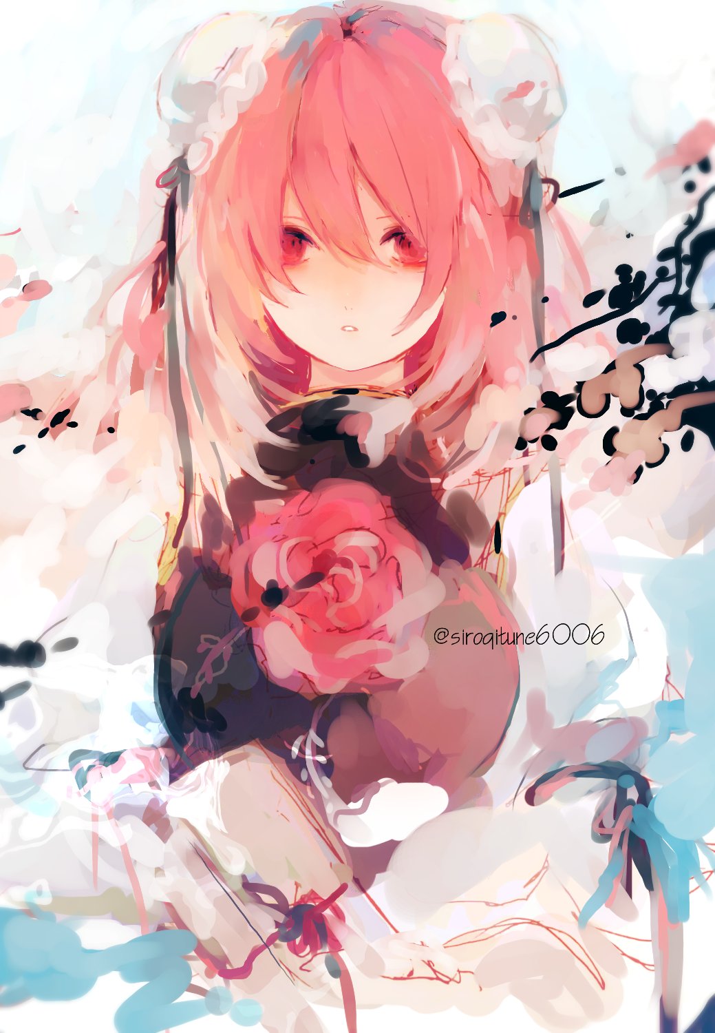1girl bun_cover commentary double_bun flower hair_bun highres ibaraki_kasen kn001215 long_sleeves looking_at_viewer parted_lips pink_eyes pink_flower pink_hair short_hair solo tabard touhou twitter_username upper_body