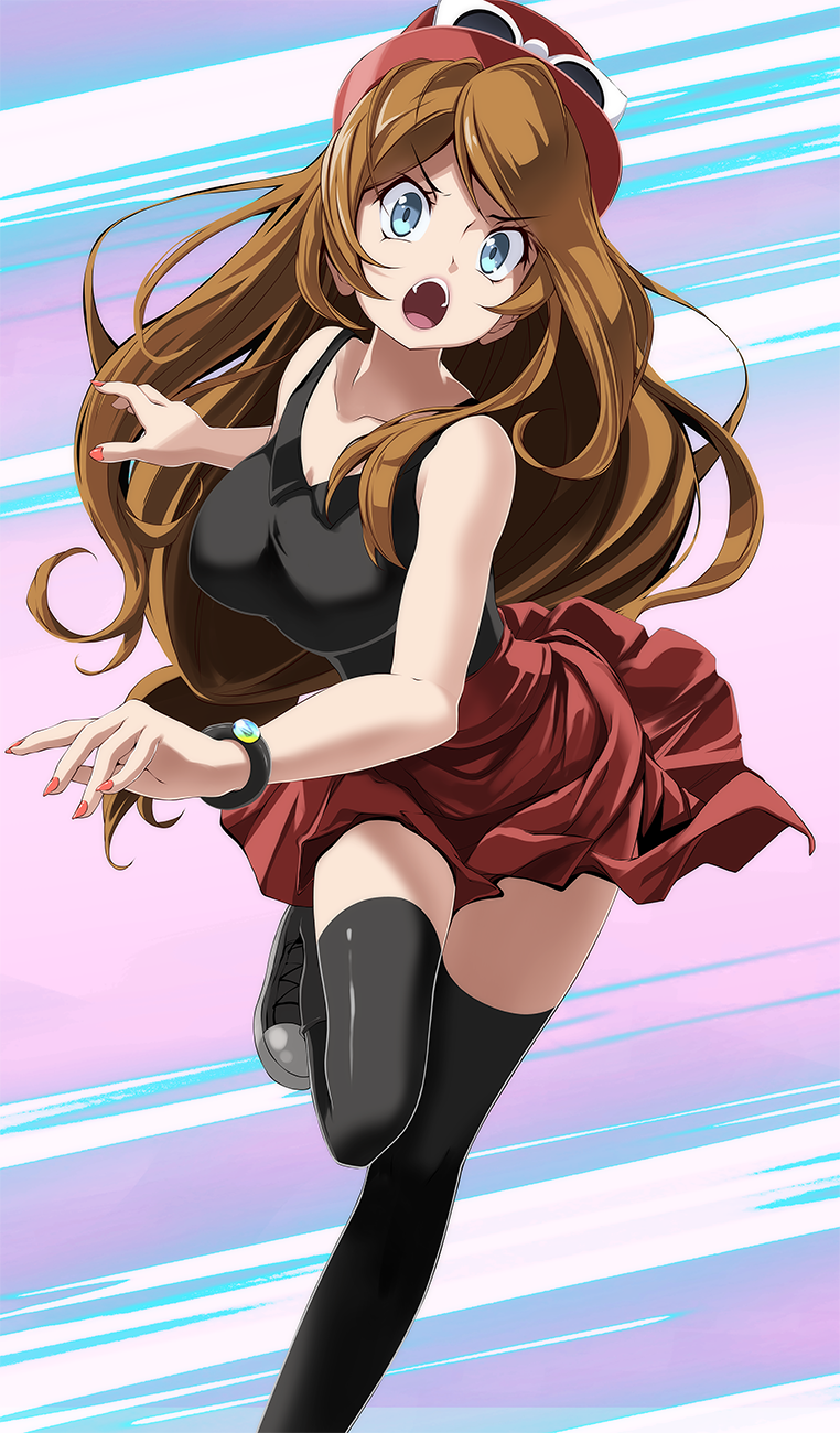 1girl :o bare_arms black_shirt black_thighhighs blue_eyes bracelet breasts brown_hair collarbone eyewear_on_headwear feet_out_of_frame female_focus floating_hair hat highres jewelry large_breasts leg_up long_hair looking_at_viewer miniskirt nail_polish nintendo open_mouth pleated_skirt pokemon pokemon_x_and_y red_hat red_nails red_skirt serena_(pokemon) shiny_clothes shiny_legwear shirt shoes skirt sleeveless sleeveless_shirt sneakers solo thighhighs tsukishiro_saika v-shaped_eyebrows very_long_hair white-framed_eyewear zettai_ryouiki