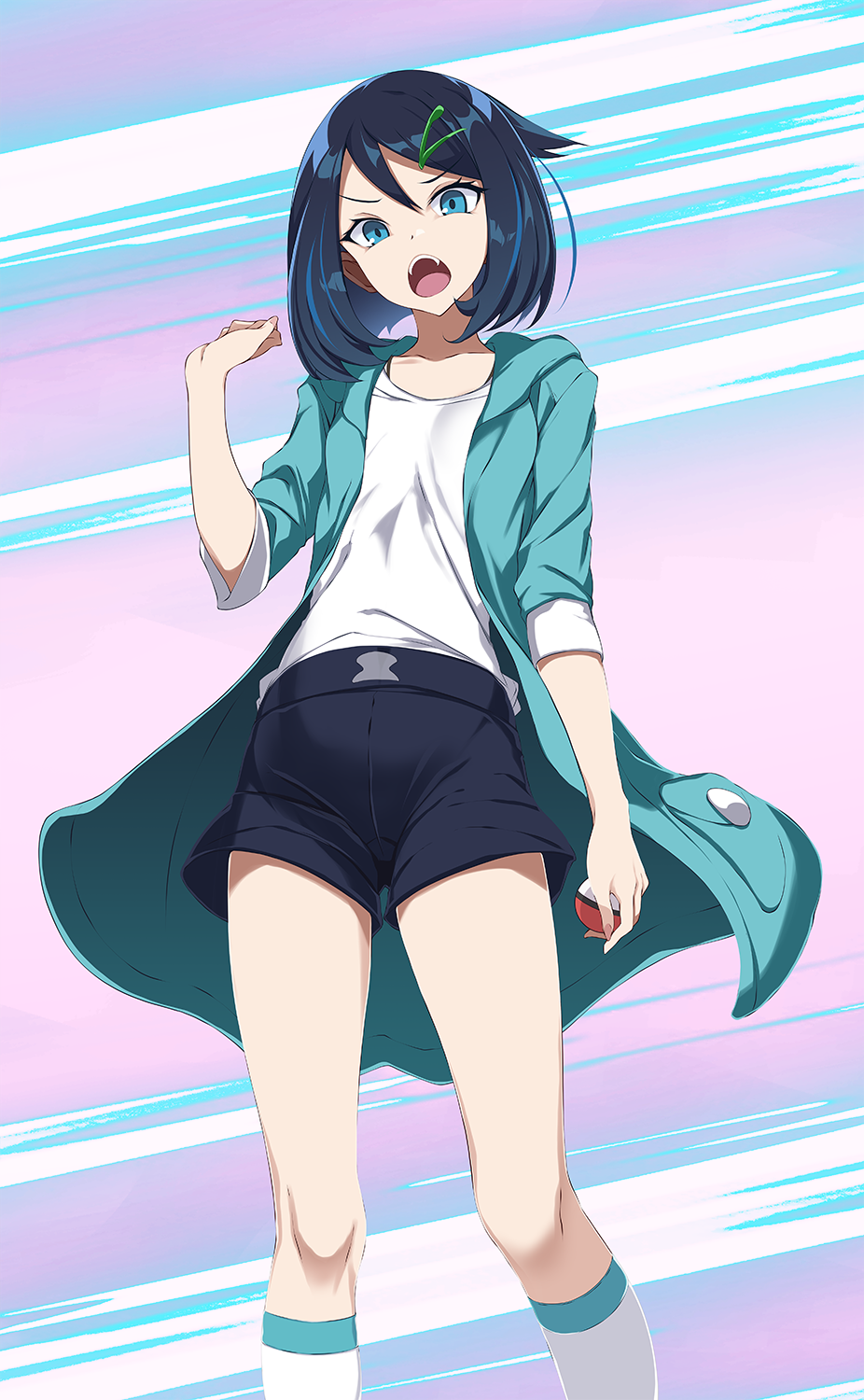 1girl black_hair black_shorts blue_eyes blue_jacket collarbone feet_out_of_frame female_focus hair_between_eyes hair_ornament hairclip high-waist_shorts highres holding holding_poke_ball hood hood_down hooded_jacket jacket liko_(pokemon) looking_at_viewer nintendo open_clothes open_jacket open_mouth poke_ball pokemon pokemon_(anime) pokemon_horizons shirt short_hair short_shorts shorts socks solo standing tsukishiro_saika white_shirt white_socks