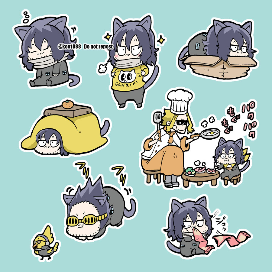 2boys aizawa_shota animal_ears animalization aqua_background bird black_hair blanket blonde_hair boku_no_hero_academia box cardboard_box cat_boy cat_ears cat_tail chef_hat chibi closed_eyes closed_mouth commentary_request eating facial_hair food fruit frying_pan goggles hat holding holding_frying_pan holding_spatula holding_unworn_clothes holding_unworn_scarf in_box in_container kemonomimi_mode koo1088 long_hair long_sleeves lying male_focus multiple_boys on_stomach orange_(fruit) outline present_mic print_shirt scarf shirt short_hair sidelocks simple_background sitting sleeping spatula stubble table tail twitter_username unworn_scarf white_outline yagi_toshinori yellow_shirt