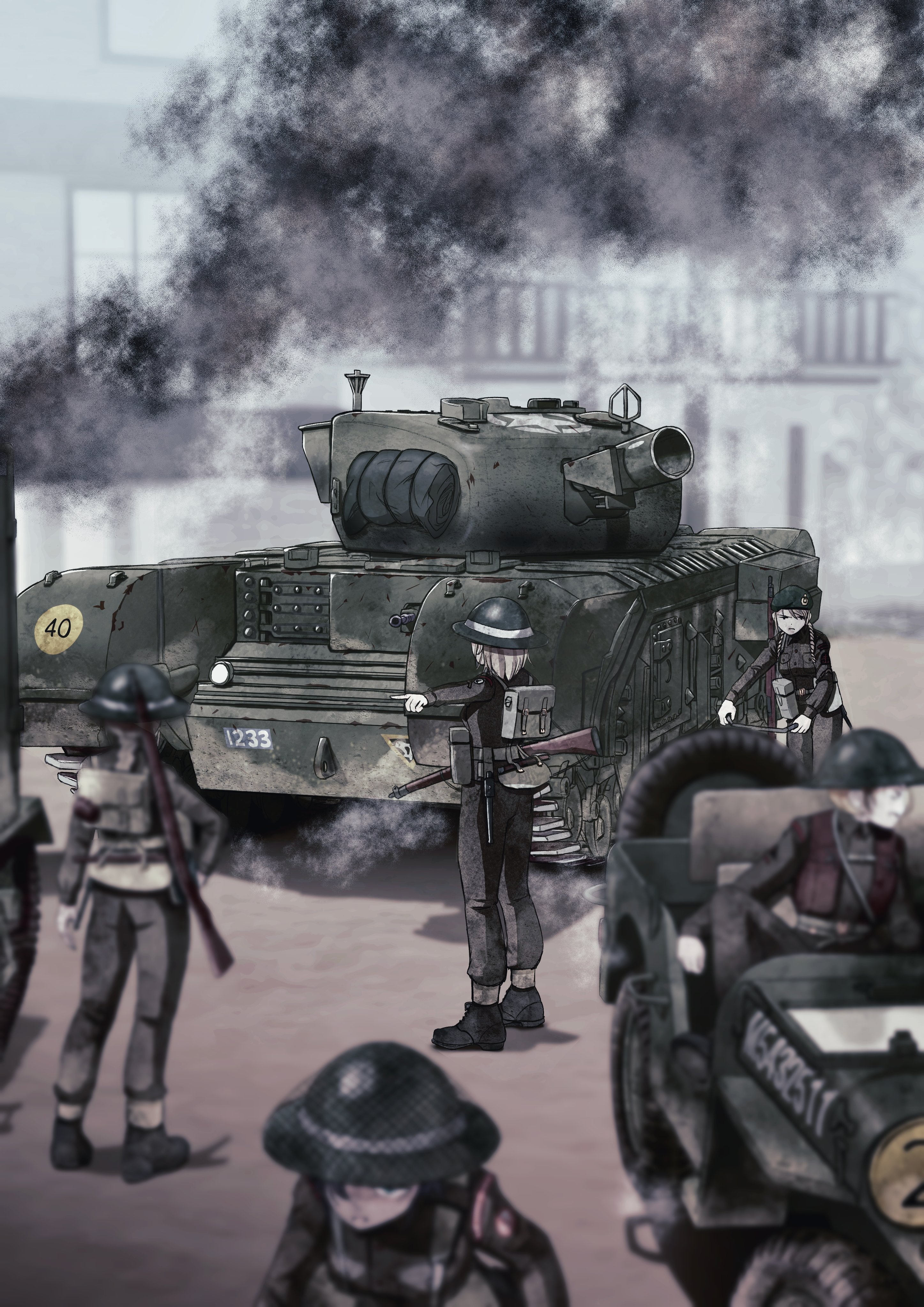 5girls absurdres beret bolt_action british_army churchill_(tank) churchill_avre combat_helmet green_headwear grey_pants gun hat helmet highres lee-enfield military_jeep military_vehicle motor_vehicle multiple_girls original pants pointing rifle saitou_kaoru_(nashorn) tank twintails vehicle_focus weapon world_war_ii