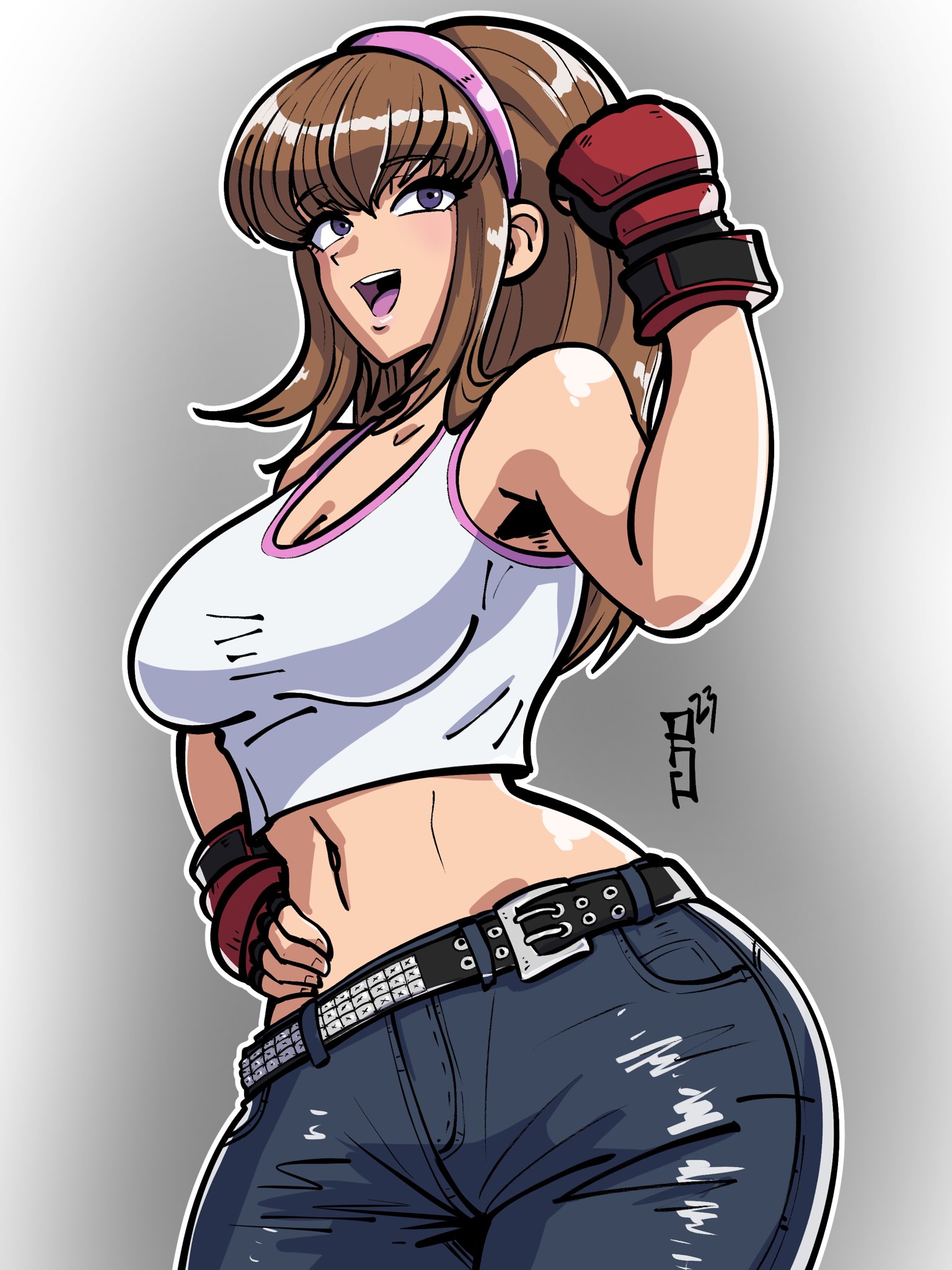 1girl bare_shoulders belt breasts brown_hair crop_top dead_or_alive denim fingerless_gloves gloves headband highres hitomi_(doa) jeans large_breasts paddy_g_(terrybrogard) pants sleeveless