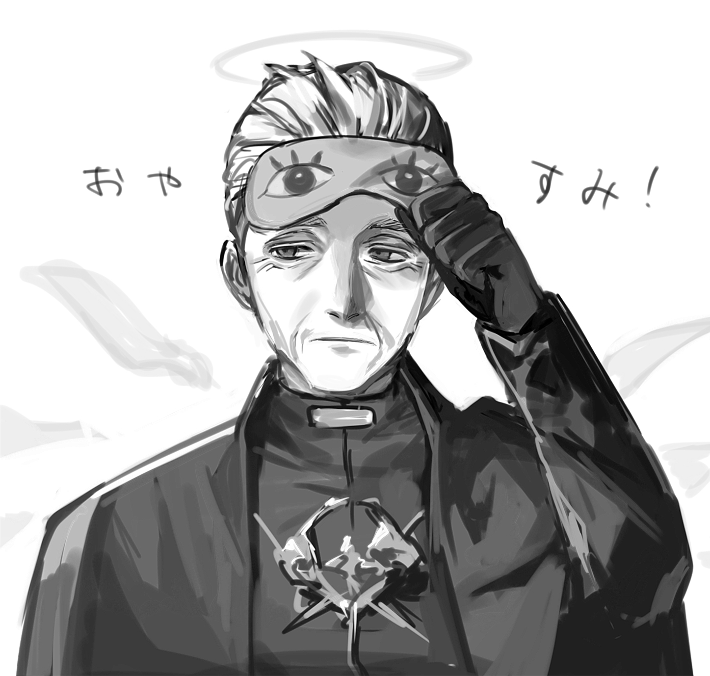1boy agenir_(arknights) arknights arm_up capelet closed_mouth detached_wings gloves greyscale hair_slicked_back halo highres long_sleeves looking_at_viewer male_focus mask mask_on_head monochrome oxy_(ho2) robe simple_background sleep_mask solo translated white_background wings