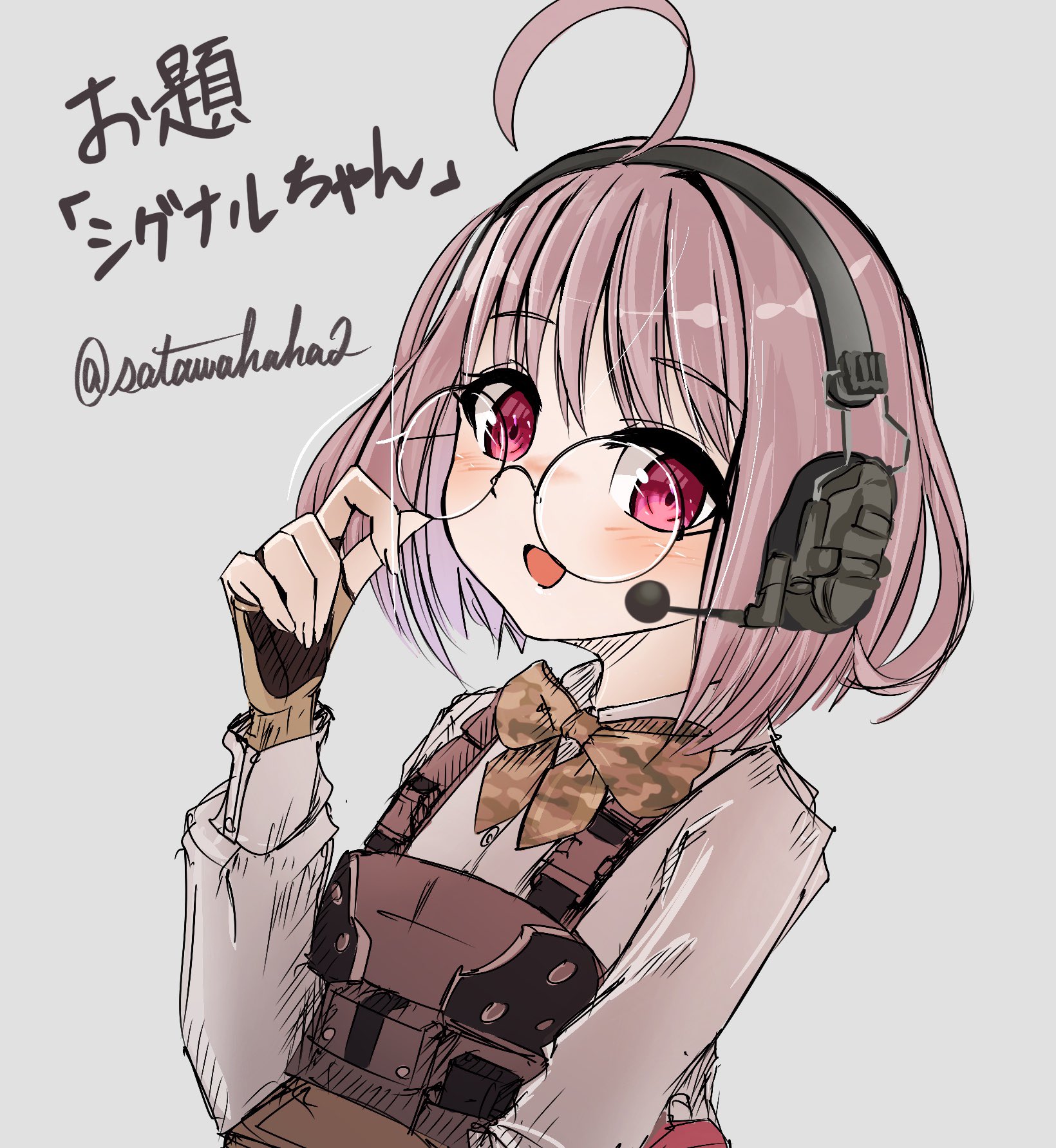 1girl :d ahoge blush bow bulletproof_vest character_name collared_shirt fingerless_gloves glasses gloves goddess_of_victory:_nikke headset highres light_brown_hair long_sleeves open_mouth red_eyes round_eyewear sata_(satawahaha) shirt short_hair signal_(nikke) simple_background smile solo twitter_username white_shirt