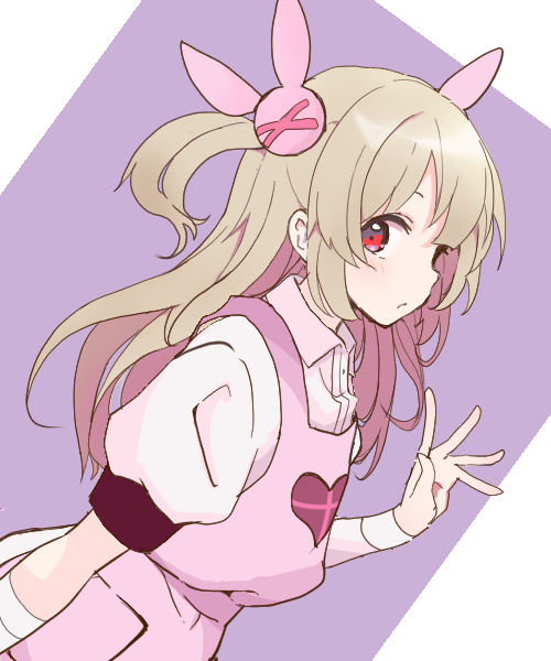 >_< 1girl apron bandages blush collared_dress dress hair_ornament heart heart_print light_brown_hair long_hair looking_at_viewer natori_sana natori_sana_(nurse) pink_apron puffy_short_sleeves puffy_sleeves rabbit_hair_ornament red_eyes sana_channel short_sleeves solo two_side_up virtual_youtuber white_dress youasato