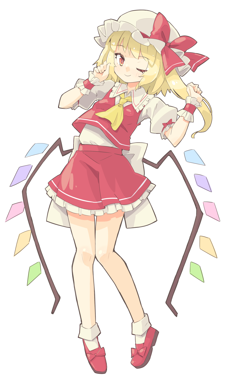 1girl arnest blonde_hair blush closed_mouth collared_shirt crystal flandre_scarlet frilled_shirt_collar frilled_skirt frills full_body hat highres long_hair mob_cap one_eye_closed one_side_up puffy_short_sleeves puffy_sleeves red_eyes red_shoes red_skirt red_vest shirt shoes short_sleeves simple_background skirt smile socks solo touhou vest white_background white_hat white_shirt white_socks wings wrist_cuffs