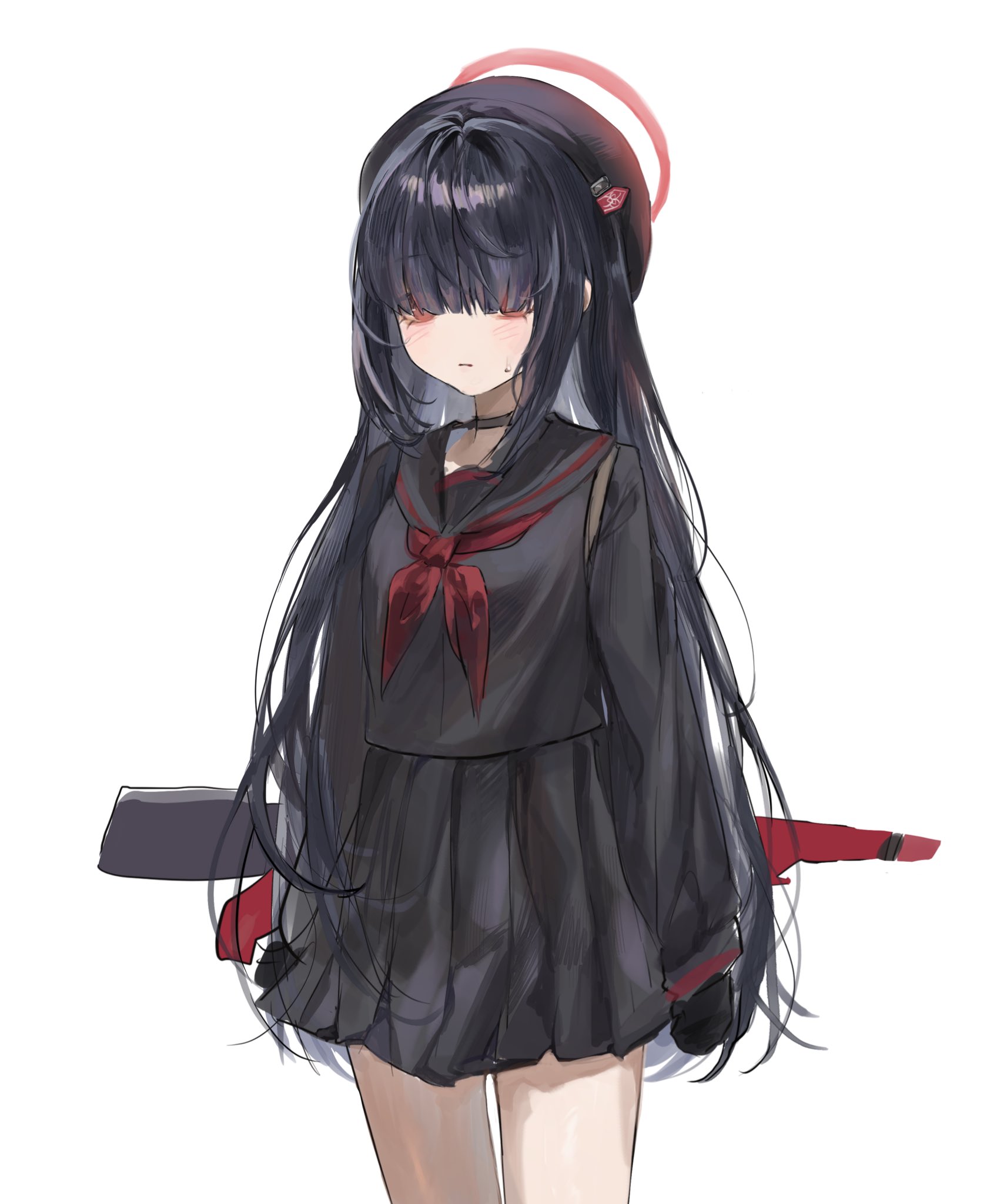 1girl beret black_choker black_gloves black_hair black_hat black_serafuku blue_archive blush breasts choker gloves hair_over_eyes halo hat highres justice_task_force_member_(blue_archive) leni_(1_en) long_hair looking_at_viewer neckerchief pleated_skirt red_eyes red_halo red_neckerchief school_uniform serafuku simple_background skirt small_breasts solo straight_hair sweatdrop very_long_hair white_background